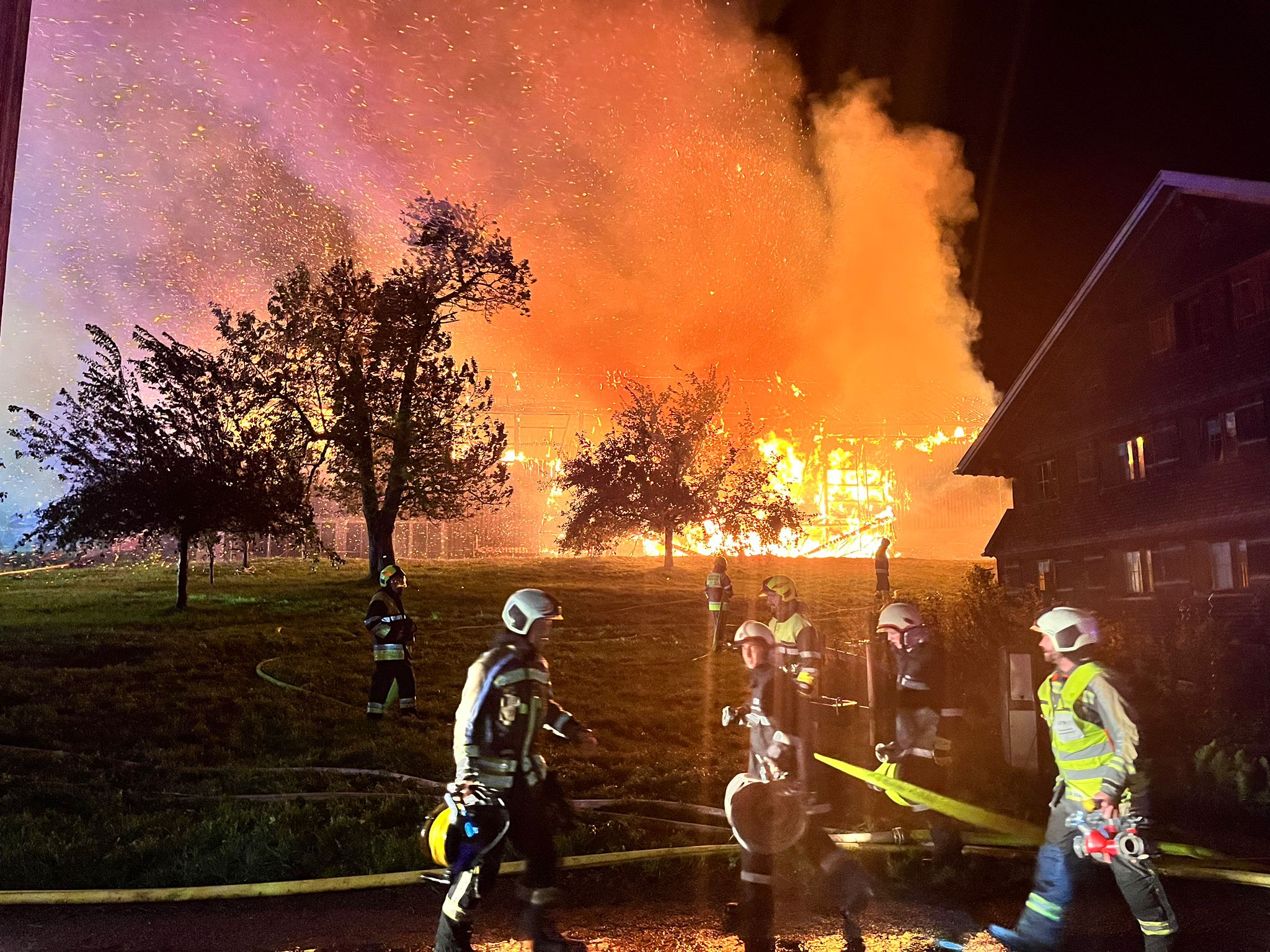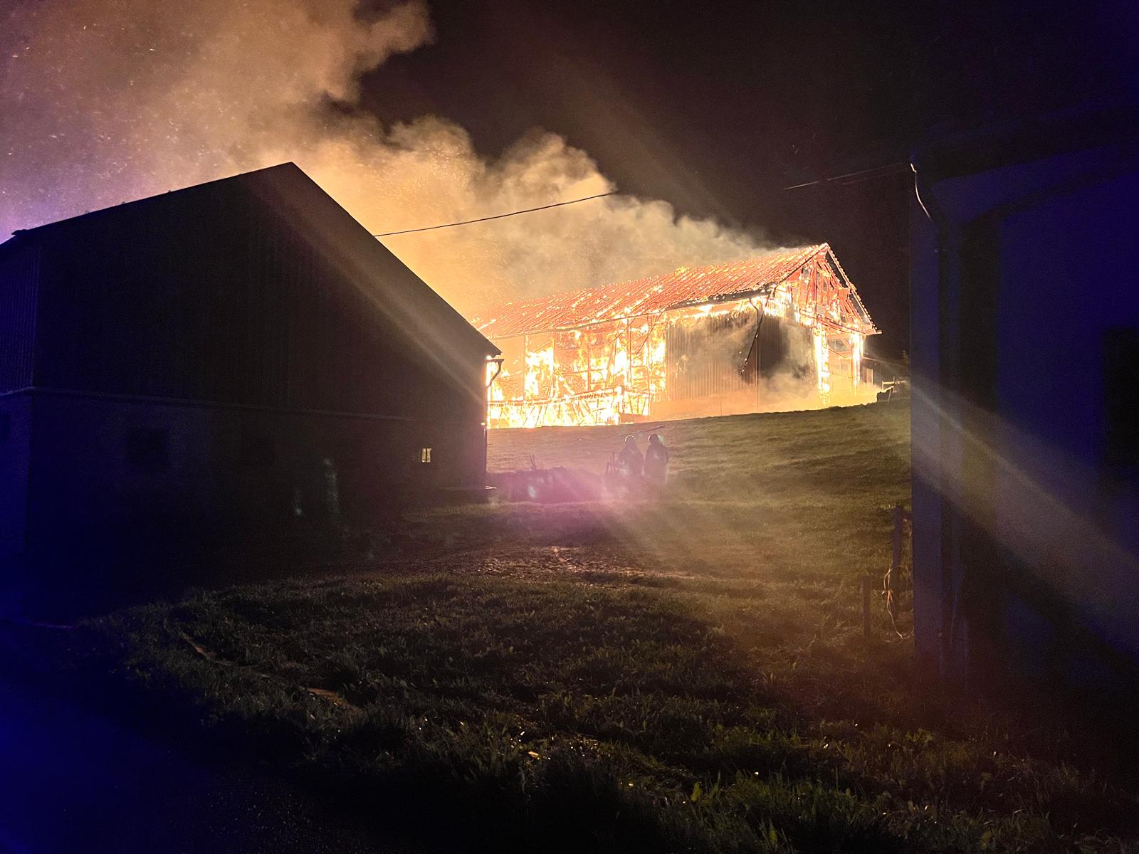 Am Montag (9. September 2024) gegen 20:30 Uhr geriet aus bislang unbekannter Ursache ein Stallgebäude in Schwarzenberg in Brand. Ein Nachbar setzte umgehend den Notruf ab. Der Besitzer des Stallgebäudes konnte mit seinen Söhnen und weiteren Personen alle Tiere aus dem brennenden Stall retten. Zur Zeit des Brandausbruchs befanden sich 30 Kühe und drei Kälber im Stall.