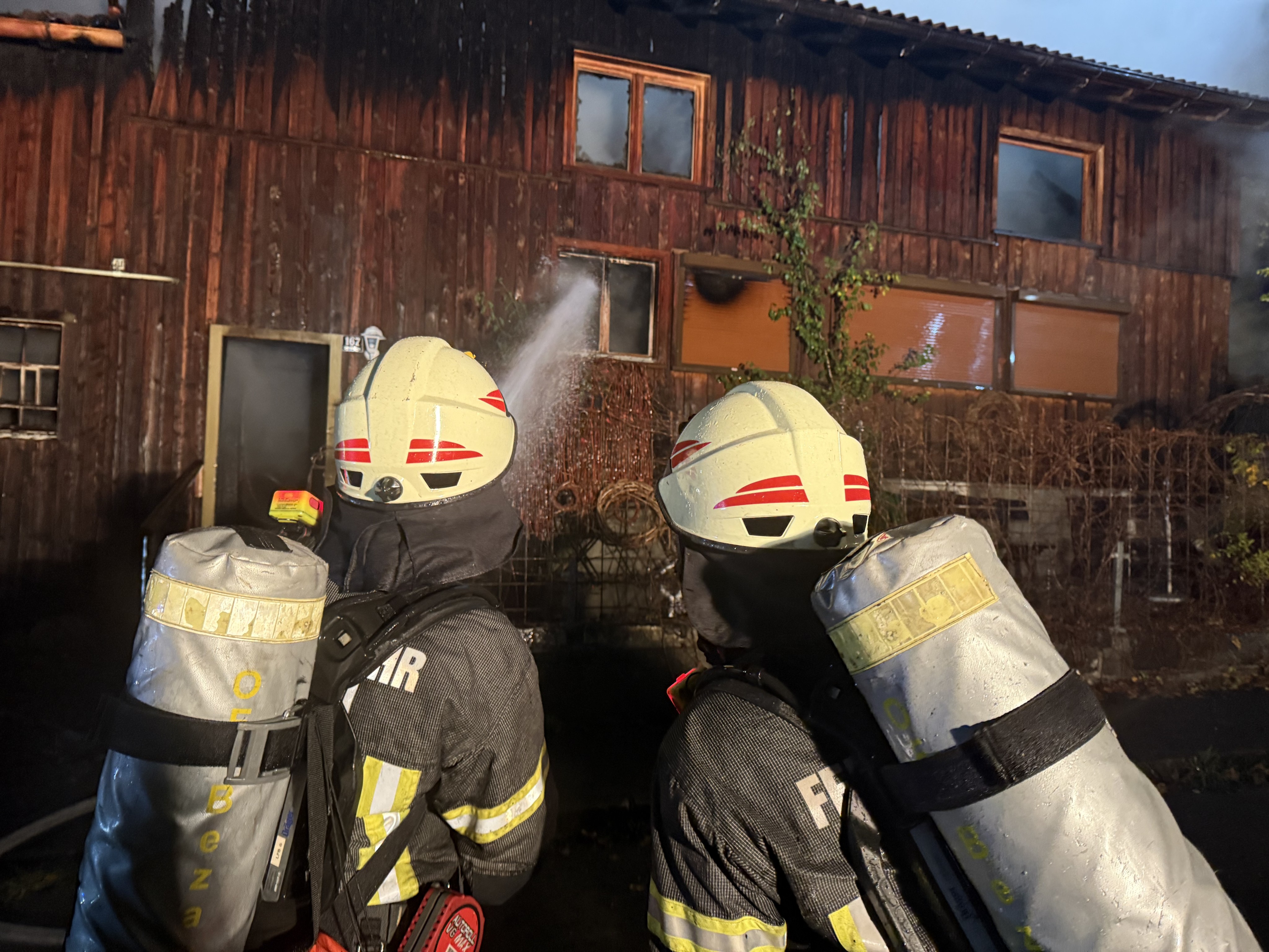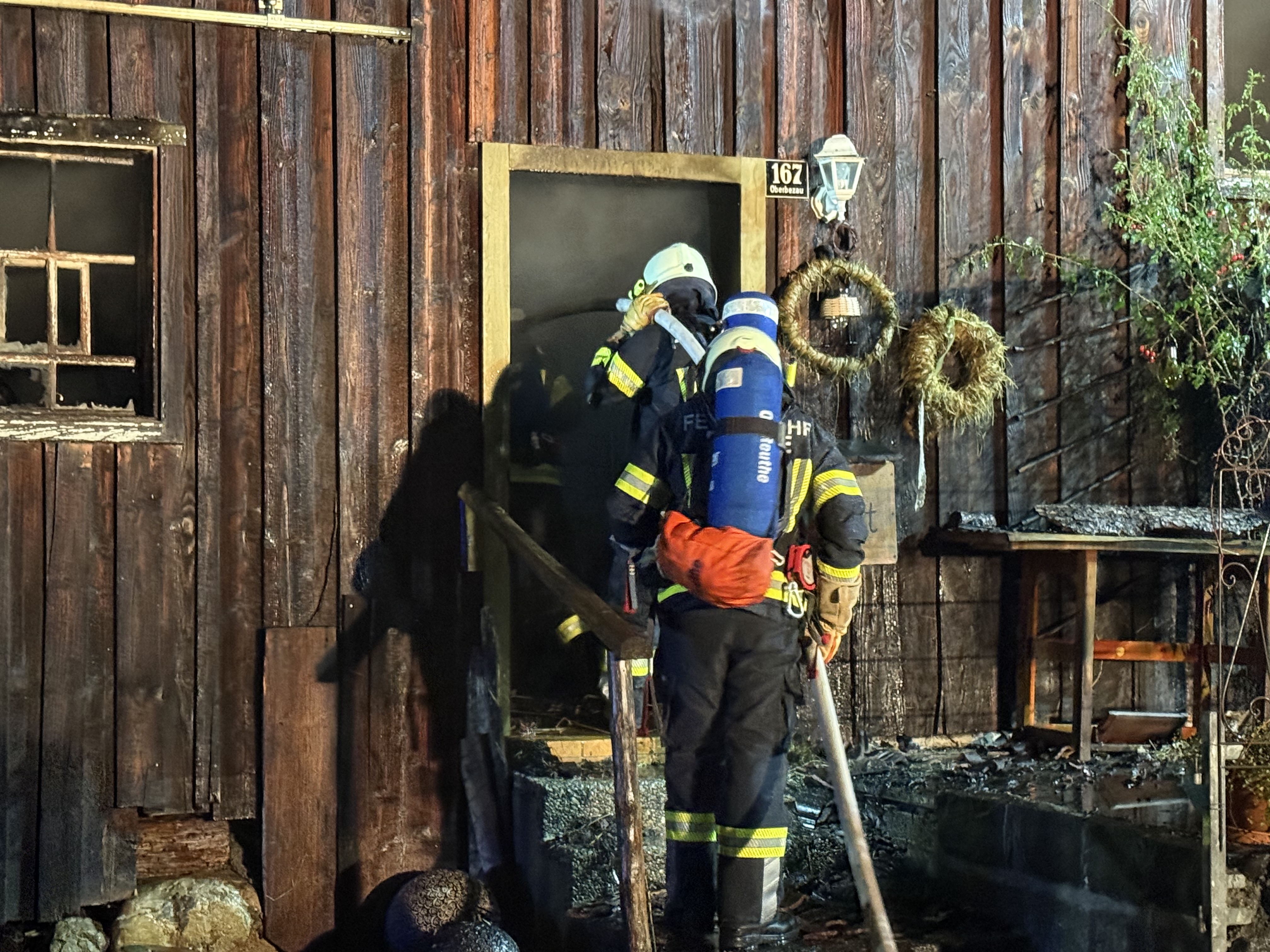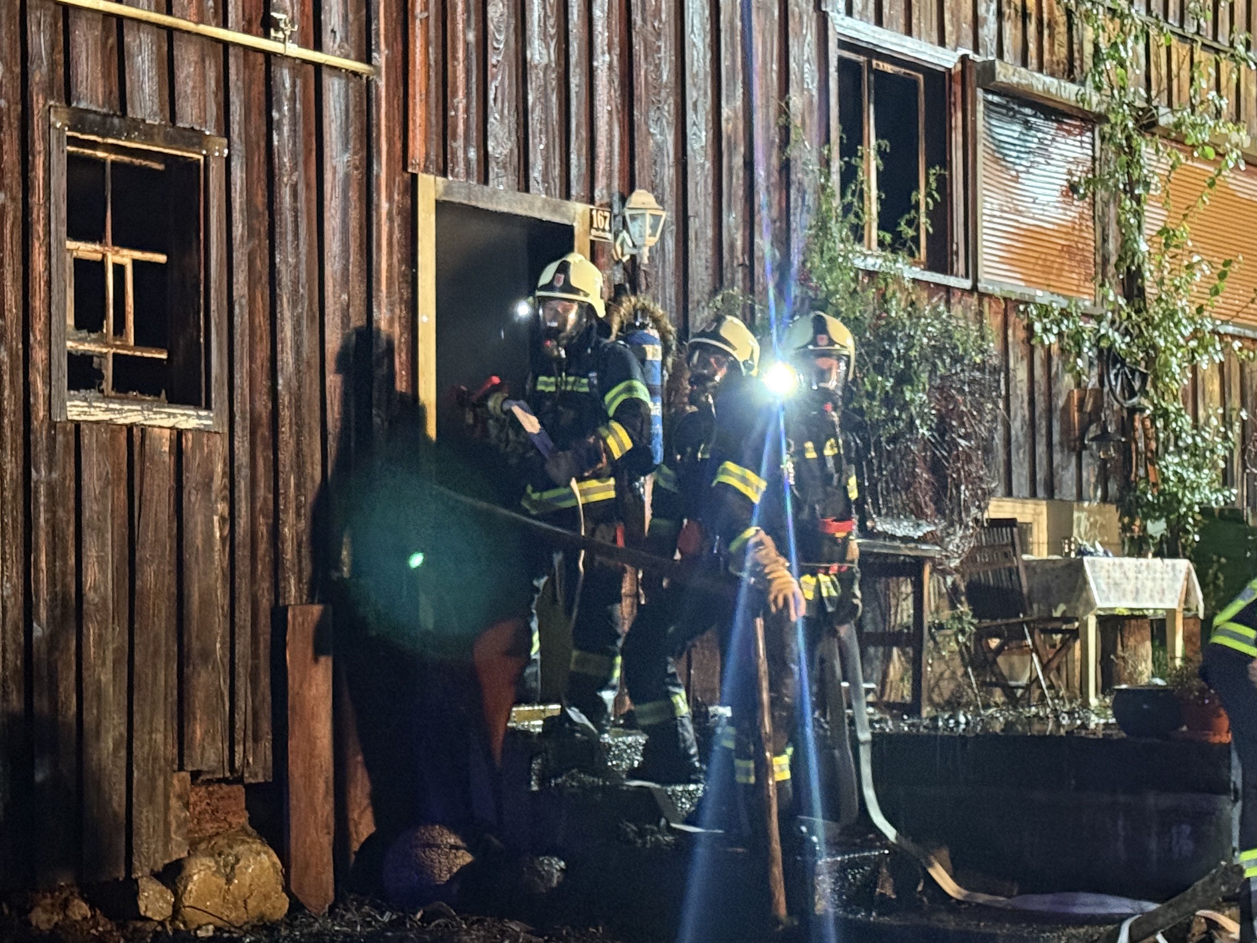 Ein Eindringen in das brennende Haus war zunächst nicht möglich. Wegen der Intensität des Feuers konnte der Atemschutz nicht eingesetzt werden. Erst später stellte sich heraus, dass sich keine Personen im Inneren befanden.