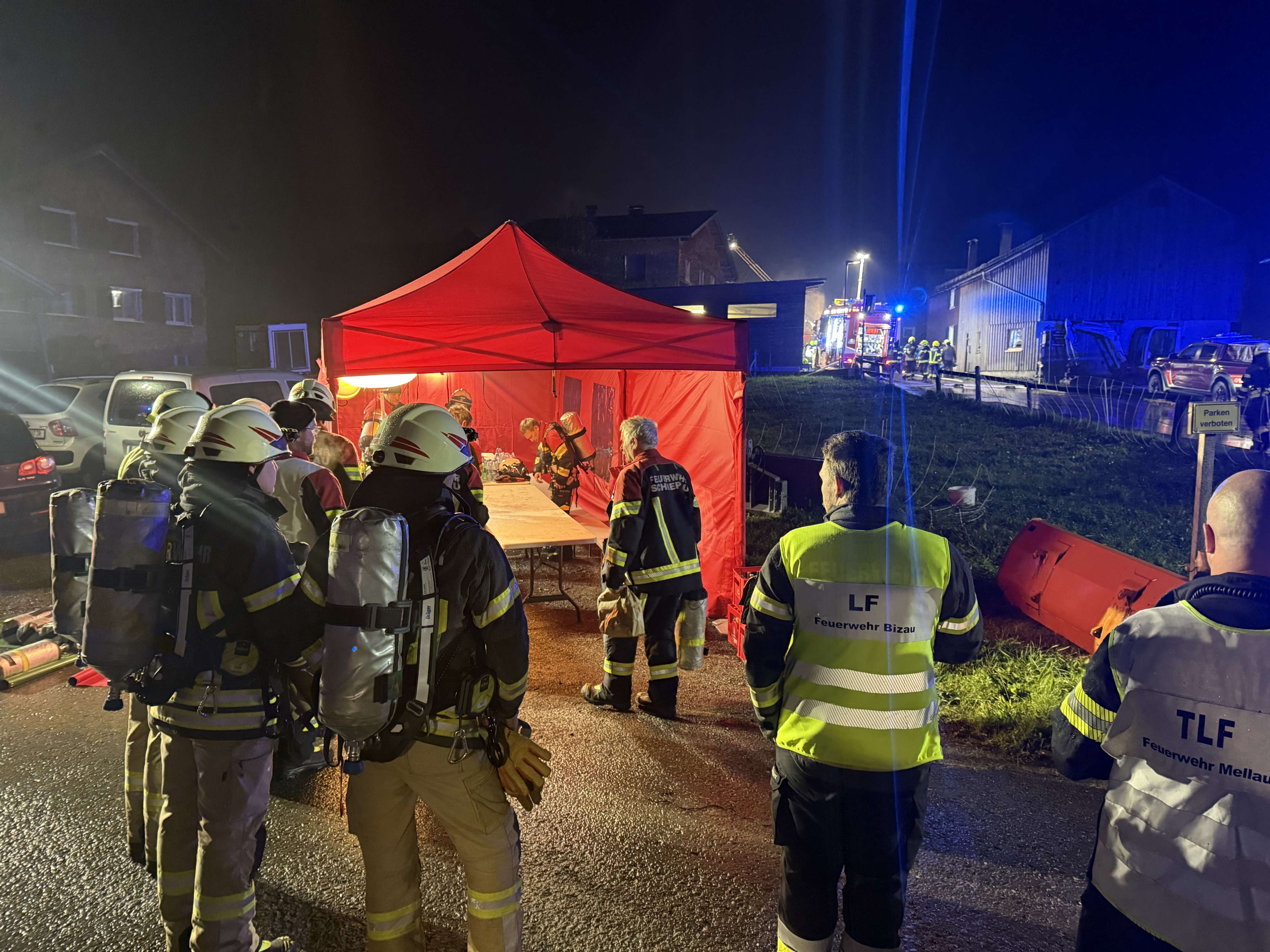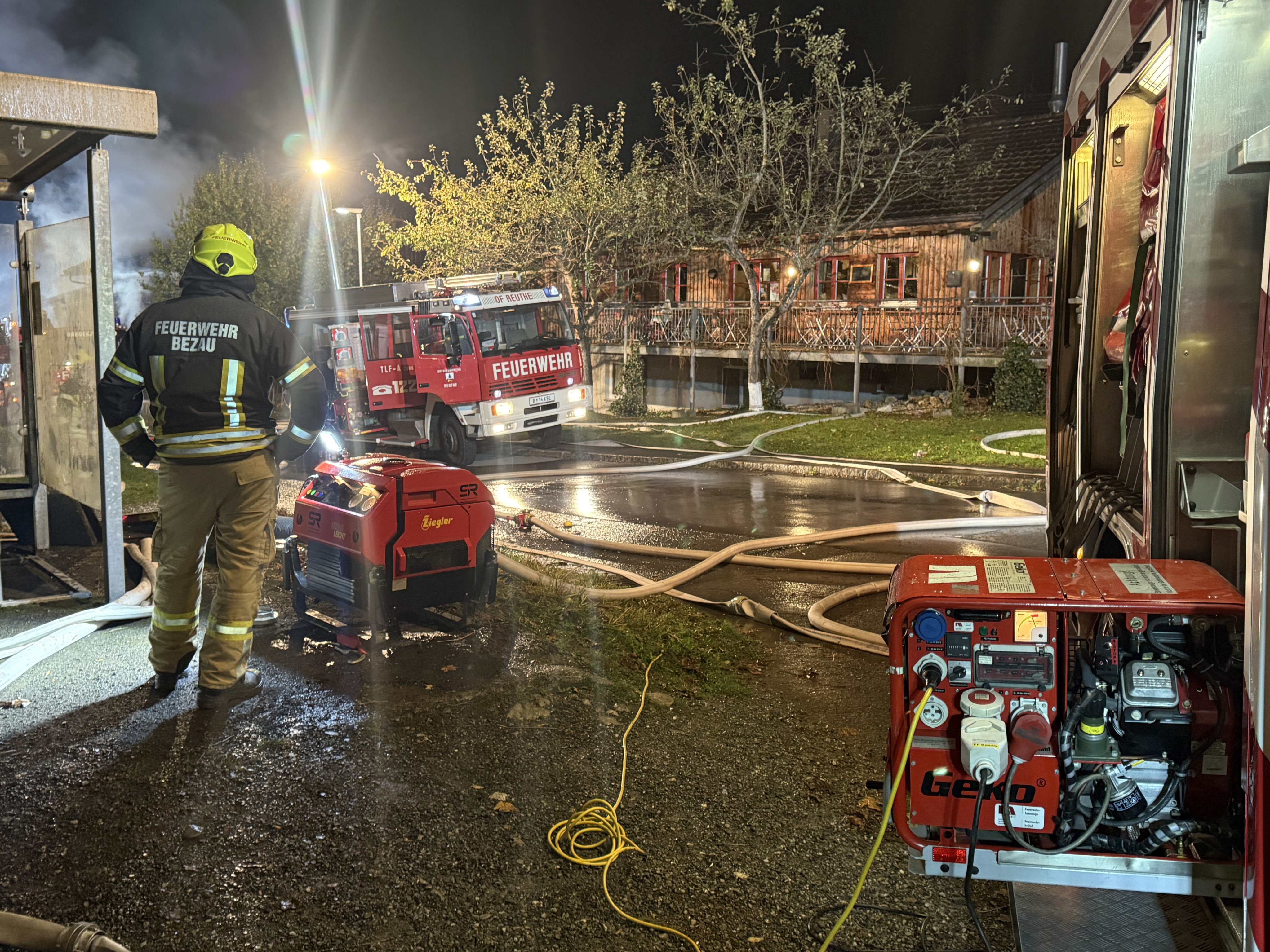 Die Feuerwehr Bezau wurde gegen 3 Uhr morgens alarmiert. Der Kommandant Martin Metzler erklärte, man habe sofort ausrücken müssen, da das Gebäude beim Eintreffen bereits lichterloh brannte. Die größte Herausforderung sei der Wind gewesen, der ein Übergreifen der Flammen auf angrenzende Objekte begünstigte. Das Hauptaugenmerk habe daher auf dem Schutz der Nachbargebäude gelegen.