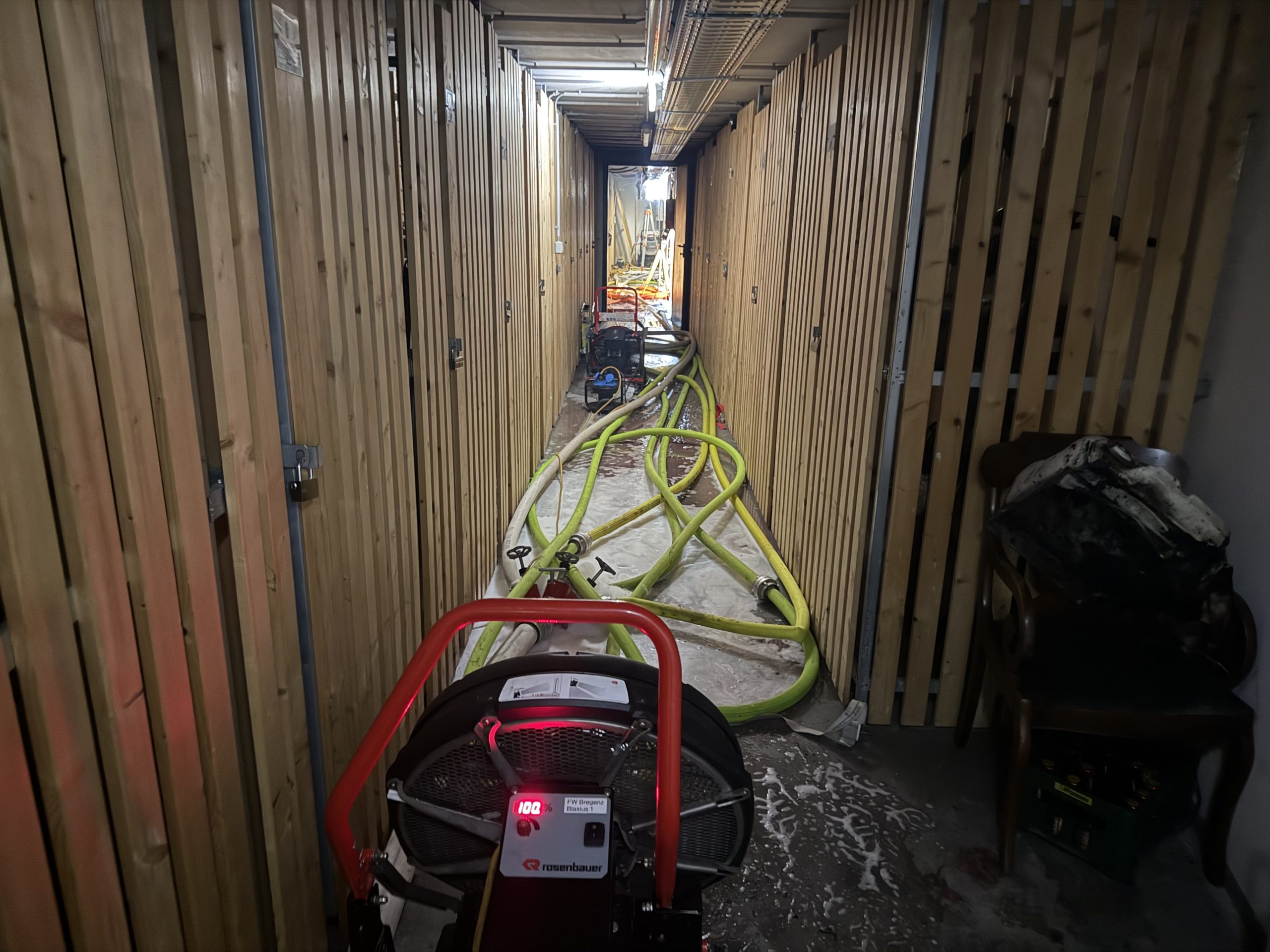 Die Feuerwehren Bregenz-Stadt, Rieden, Vorkloster, Fluh, Hard, und die Betriebsfeuerwehr der VKW rückten gemeinsam mit rund 100 Einsatzkräften zum Brandort aus. Beim Eintreffen der ersten Löschmannschaften war im hinteren Bereich des Kellers bereits Feuer ausgebrochen.