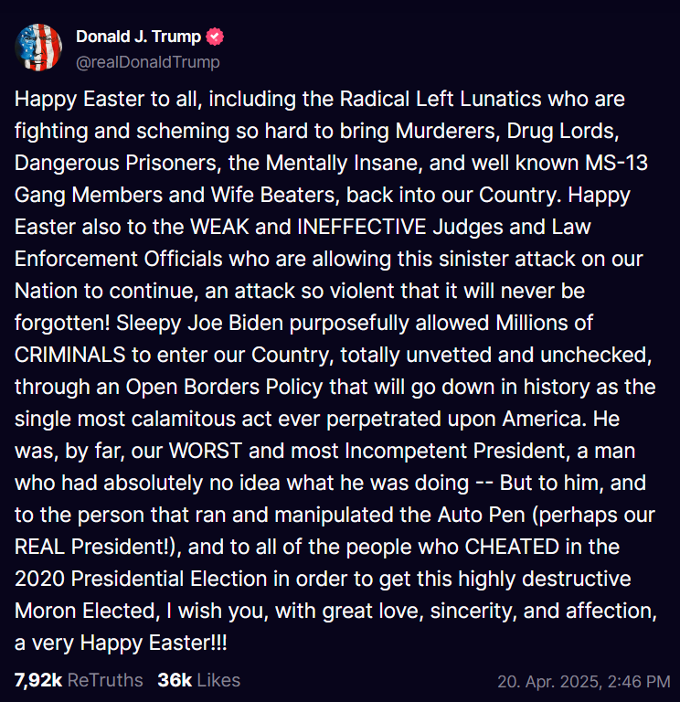 "Frohe Ostern für alle, einschließlich der linksradikalen Irren, die so hart kämpfen und intrigieren, um Mörder, Drogenbarone, gefährliche Gefangene, Geisteskranke, bekannte MS-13-Bandenmitglieder und Frauenschläger zurück in unser Land zu bringen", schrieb Trump auf seiner Plattform Truth Social.