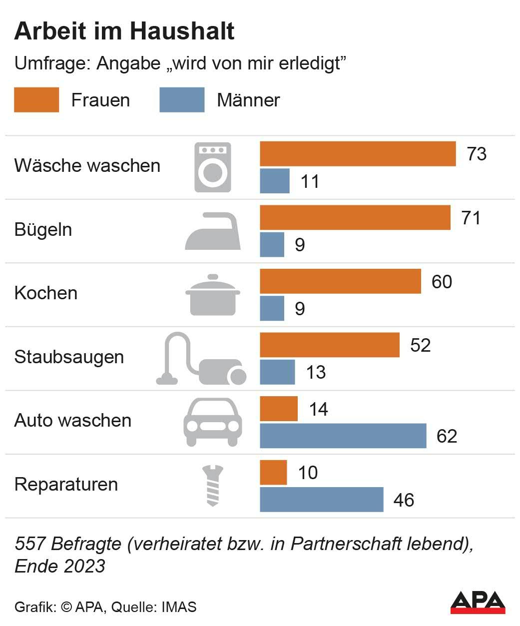 Frauen waschen, bügeln und kochen, Männer kümmern sich um das Auto und Reparaturen, das ergab zusammengefasst die Umfrage des IMAS-Instituts, in der Ende des Vorjahres 1.011 Österreicherinnen und Österreicher, davon 557 verheiratete oder in Partnerschaft lebende Personen, repräsentativ für die Bevölkerung ab 16 Jahren, persönlich interviewt wurden. Trotz eines gewissen gesellschaftlichen Wandels "scheint aber eine gewisse Rollenverteilung in der Hausarbeit von Partnerhaushalten fast eingefroren und unverändert zu sein", schlussfolgert IMAS. Die Umfrage bilde den Ist-Zustand gut ab, da die Antworten beider Geschlechter im Großen und Ganzen übereinstimmten.