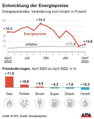 Der von der Energieagentur berechnete Energiepreisindex (EPI) stieg im Vergleich zum Vormonat um 2,4 Prozent an und wirkte damit wieder inflationstreibend. Im Vergleich zum Vorjahresmonat stand ein Plus von 14,5 Prozent, im Zweijahresvergleich - also April 2021 zu April 2023 - war es ein Plus von 60 Prozent.
