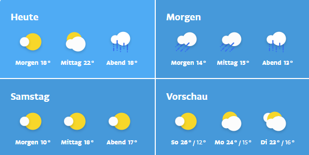 Am Sonntag bleibt es freundlich und spätsommerlich warm mit Höchstwerten bis zu 26 Grad. Der Montag startet mit dichteren Wolken und stellenweisem Regen, bevor sich am Nachmittag wieder die Sonne zeigt. Auch am Dienstag bleibt es zunächst trocken und föhnig, später können jedoch Schauer oder Gewitter auftreten.