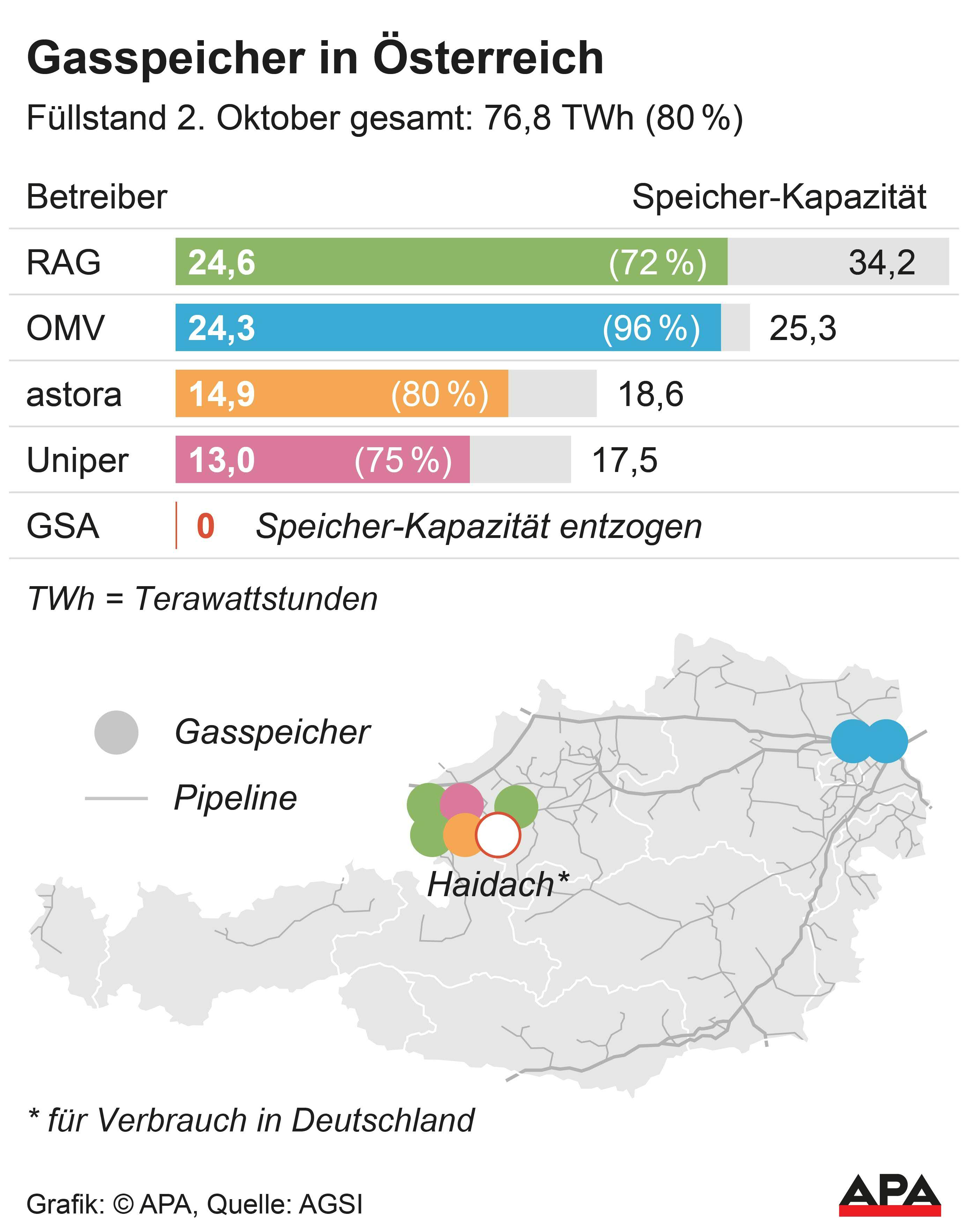 Nämlich die 20 Terawattstunden staatliche Reserve und circa 25 Terawattstunden von Versorgern oder Unternehmen. Der Jahresverbrauch in Österreich seien aber rund 90 Terawattstunden.