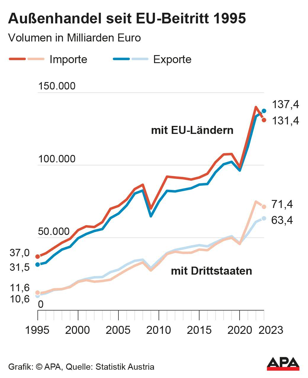 Eine Wifo-Berechnung von vor fünf Jahren ergab, dass der Außenhandel dank EU-Mitgliedschaft pro Jahr real 0,7 Prozentpunkte zum Wachstum beigetragen hat, erinnerte Wifo-Experte Harald Oberhofer. Österreichs Handel mit den EU-Ländern lag demnach um rund 40 Prozent höher als es ohne EU-Mitgliedschaft der Fall gewesen wäre.