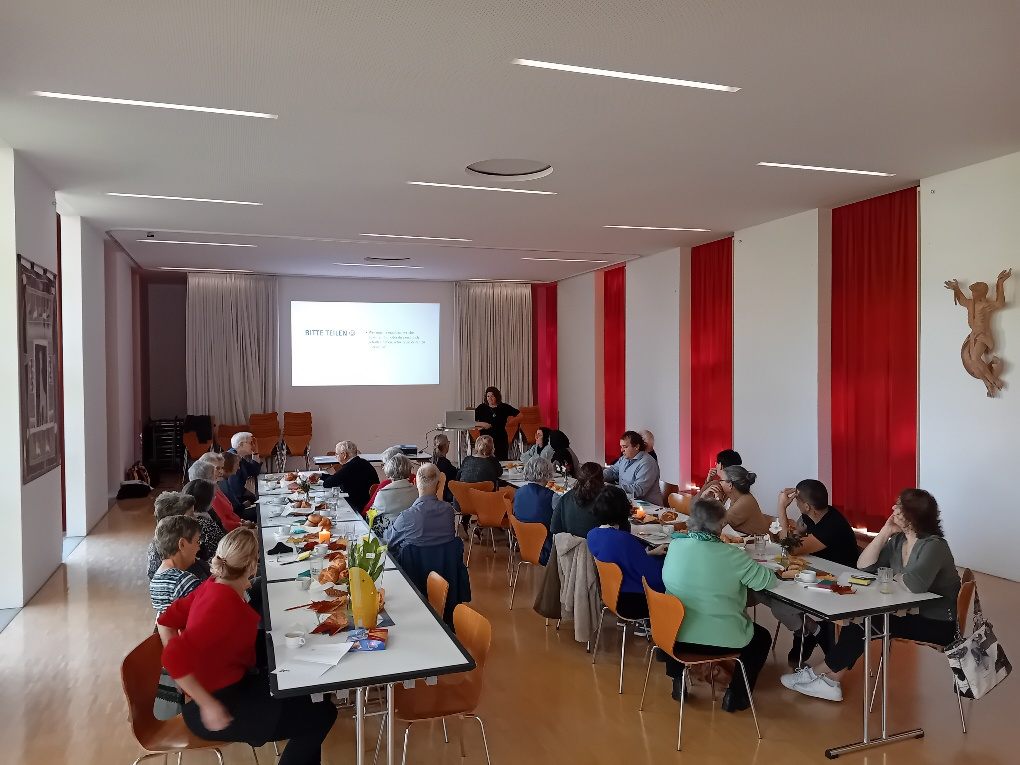 Auf Einladung der Satteinser Projektgruppe herz.com trafen sich Mitte Oktober rund dreißig Interessierte im Pfarrsaal Satteins zu einem Frühstück mit Impulsvortrag. Sandra Küng von der PfarrCaritas sprach über das Thema Resilienz. „Wir alle erleben Krisen, entscheidend ist, wie wir damit umgehen und was uns stärkt,“ so die Vortragende. „Soziale Unterstützung, Selbstwirksamkeit und Optimismus spielen eine große Rolle.“ Sehr berührend waren auch die persönlichen Erfahrungen, die einige Besucher*innen teilten.