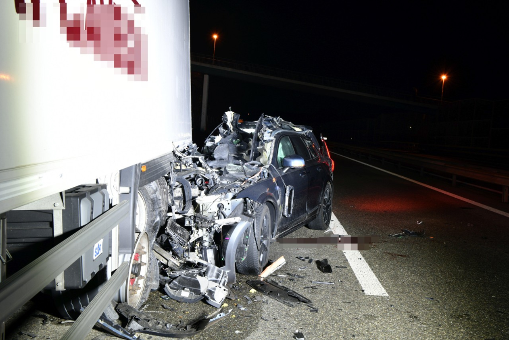 Während die Einsatzkräfte den ersten Unfall sicherten, musste der rechte Fahrstreifen in Richtung Zürich gesperrt werden. Es bildete sich ein Rückstau. Um 23.40 Uhr näherte sich ein Volvo dem Stauende. Auf dem Überholstreifen fahrend, prallte der Lenker mit voller Wucht in das Heck eines stehenden Sattelzuges – und wurde dabei unter dem Anhänger eingeklemmt.