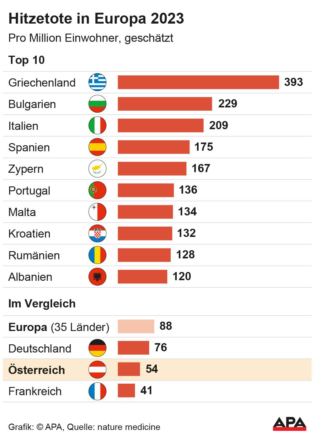 Unter Berücksichtigung der Bevölkerungszahl stellte die Forschungsgruppe fest, dass die Länder mit den höchsten hitzebedingten Sterberaten in Südeuropa liegen: So belegen Griechenland (393 Todesfälle pro eine Million Einwohner), Bulgarien (229), Italien (209) und Spanien (175) die ersten vier Plätze der Schätzung. In Deutschland lag diese Rate 2023 bei 76 Todesfällen und in Österreich bei 54 Todesfällen pro eine Million Einwohner.
