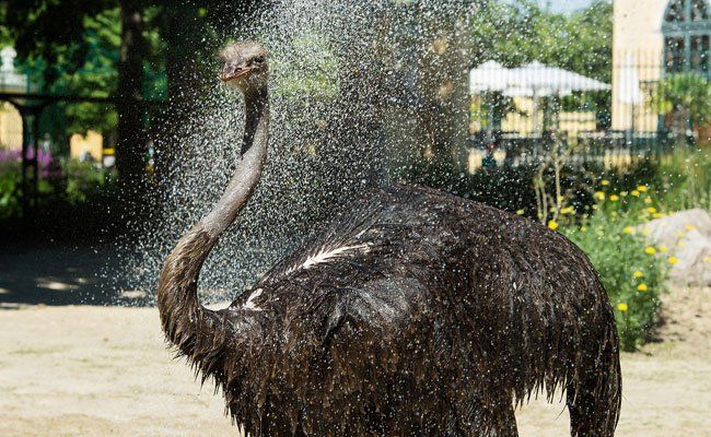 Auch den Afrikanischen Straußen kann die derzeitige Hitzewelle natürlich nichts anhaben. Dennoch schätzen es die imposanten Vögel, wenn die Tierpfleger den Wasserschlauch auspacken. Einmal am Tag ist Duschen angesagt. Und da lassen sich die vier Strauße, der Hahn Pipo und die Hennen Gina, Lolo und Beate, nicht lange bitten. Schratter erzählte: “Die vier Vögel stellen oder legen sich direkt in den Wasserstrahl und halten ganz still. Hin und wieder breiten sie genießerisch die Flügel aus.” Gleich nach dem Duschen nehmen sie dann noch ein Sandbad, um ihr Gefieder zu pflegen.