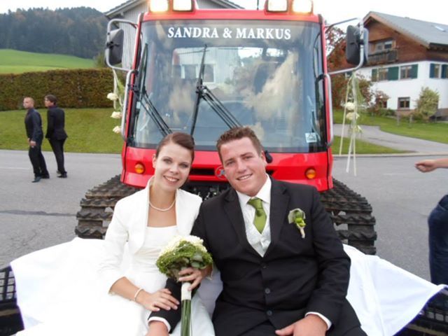 In Hittisau angekommen, die 3. Überraschung: ca. 500 m vor dem Ortszentrum wartete eine Pistenwalze auf das Brautpaar. Mit dieser wurden sie zum Ritter von Bergmann Saal gefahren.