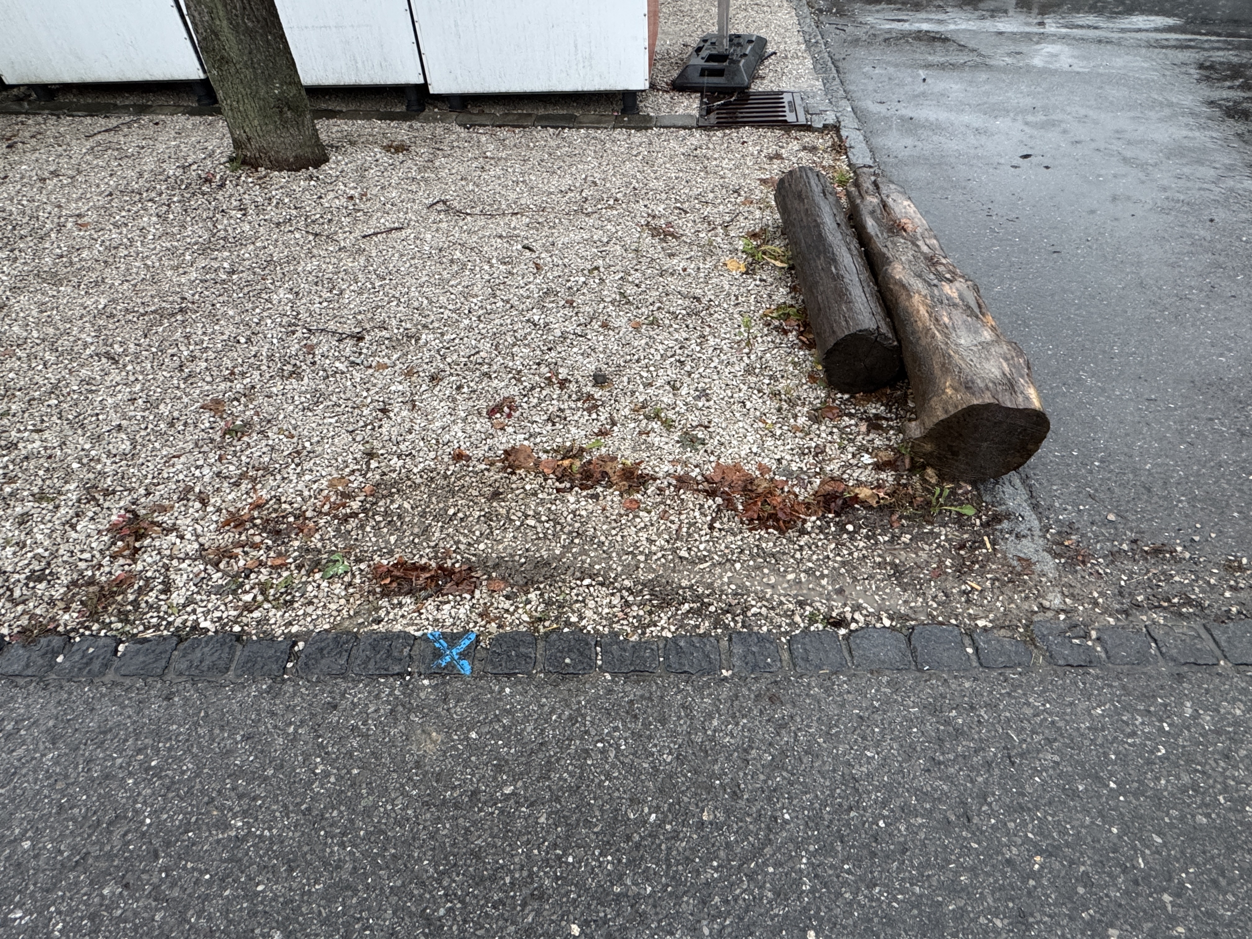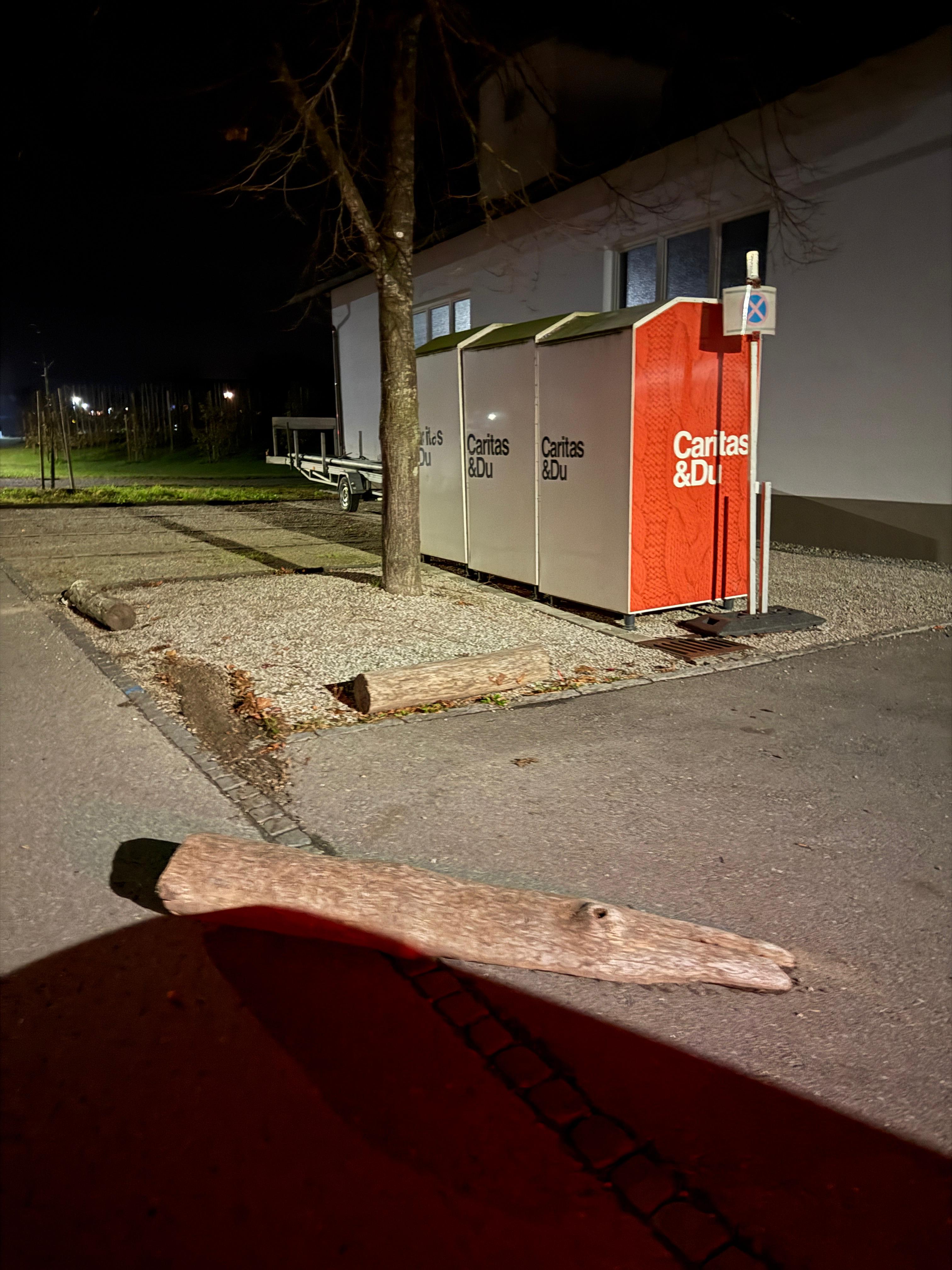 Die Situation ist ungewöhnlich. Der Baumstamm liegt nicht dort, wo er eigentlich hingehört. Stattdessen versperrt er die Durchfahrt – an einer Stelle, die regelmäßig von Anrainern sowie werktags von Mitarbeitern und Besuchern der Sammelstelle befahren wird. Deutliche Schleifspuren im Schotter lassen keinen Zweifel: Der Stamm wurde bewegt. Gezielt.