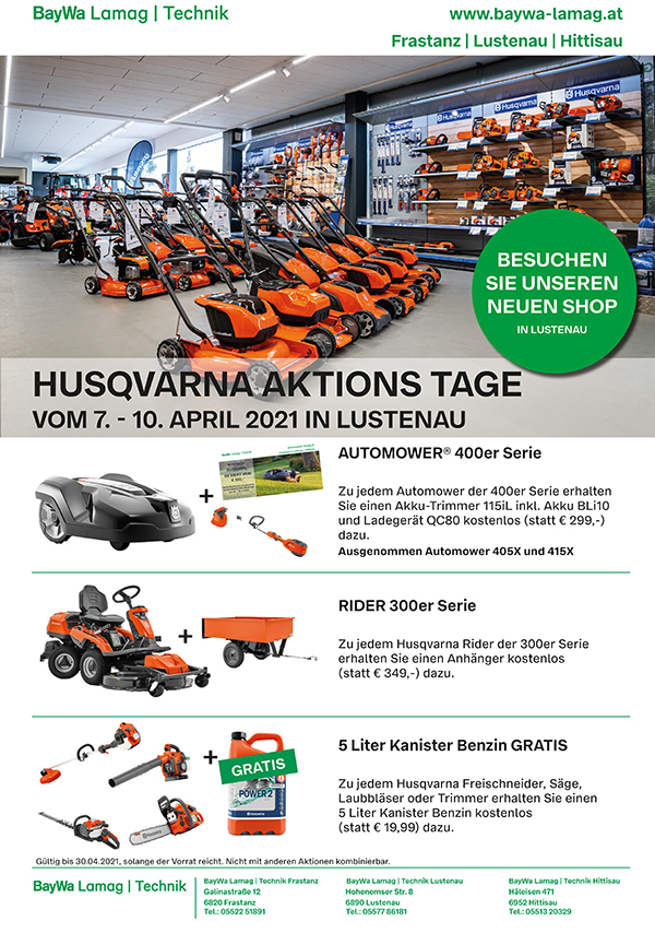 Vom 7. bis 10. April läuten wir am Standort Lustenau den Frühling mit tollen Angeboten für Sie ein – unsere Husqvarna-Aktionswoche, da ist für jeden was dabei.