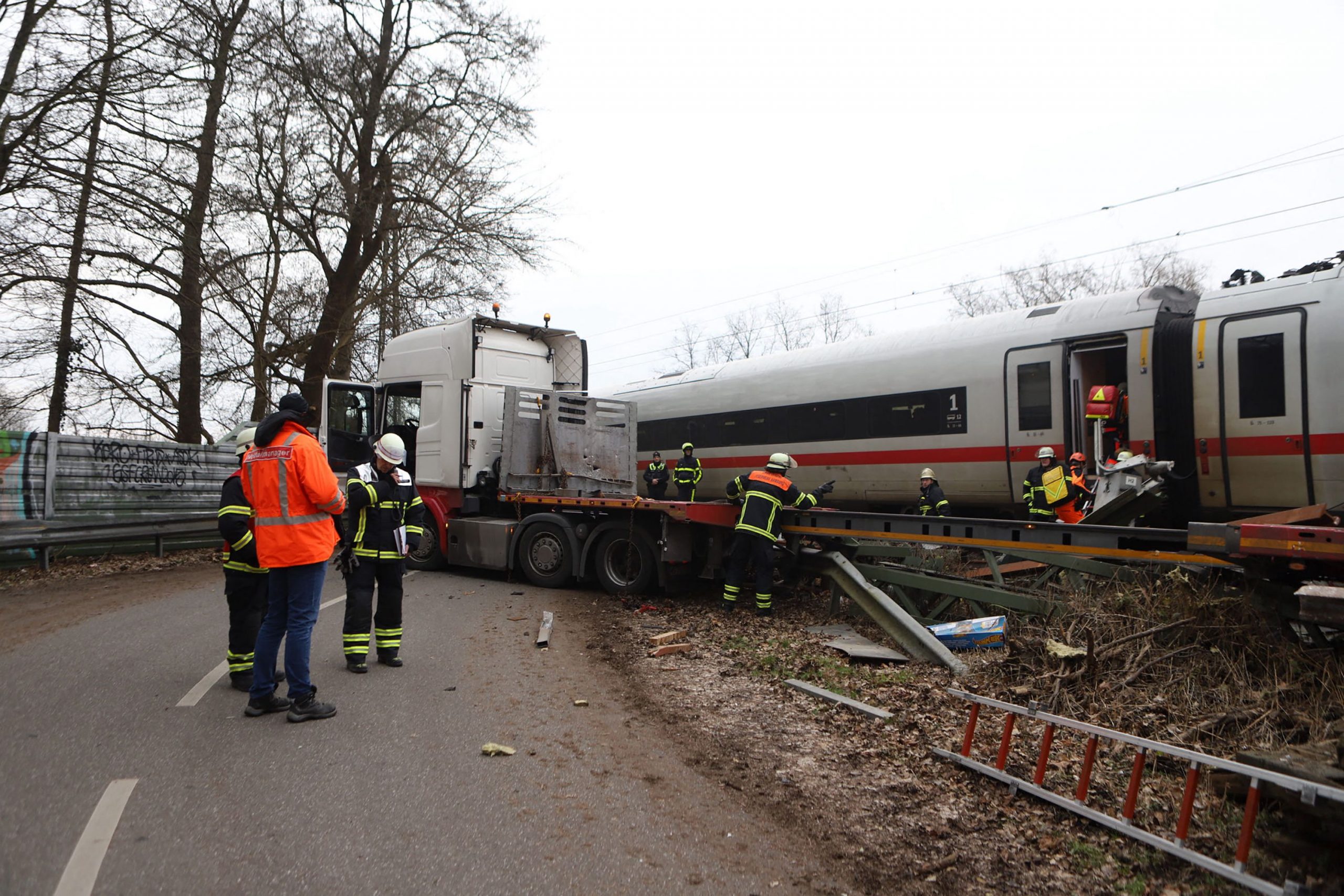 Warum es zu dem Unfall an dem Bahnübergang kam, ist noch unklar. Der Lastwagen hatte ersten Erkenntnissen zufolge wohl Bahnschienen geladen. Die Ladung verteilte sich bei der Kollision weit entlang des Unfallortes. Die Bahnstrecke zwischen Hamburg-Harburg und Buchholz in Niedersachsen wurde gesperrt. Die Auswirkungen für Reisende im Fernverkehr seien jedoch gering, sagte eine Bahnsprecherin. Die Züge werden ihren Angaben zufolge umgeleitet. Es komme zu Verspätungen von etwa 15 Minuten.