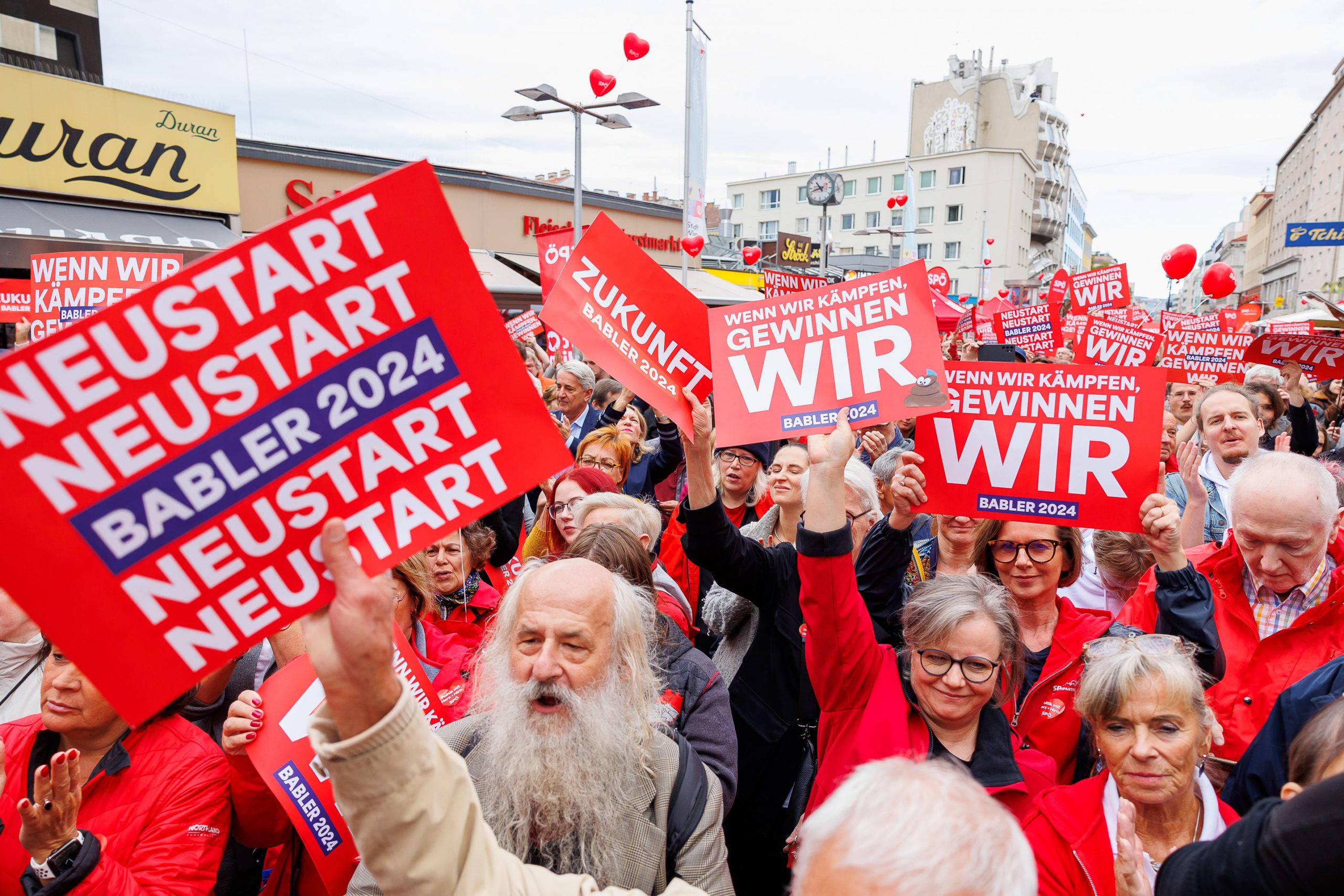 Bei früheren Bundes-Wahlen hatte die SPÖ ihren Abschlussevent vor der eigenen Parteizentrale in Szene gesetzt. Diesmal legte man ihn mit jenem der Wiener Landespartei zusammen, der traditionell Samstagvormittag im Herzen von Favoriten stattfindet. Gekommen war der Parteiadel der Hauptstadt-Sozialdemokraten von Bürgermeister Michael Ludwig über Arbeiterkammer-Präsidentin Renate Anderl, ÖGB-Chef Wolfgang Katzian bis zu den meisten Stadträten.