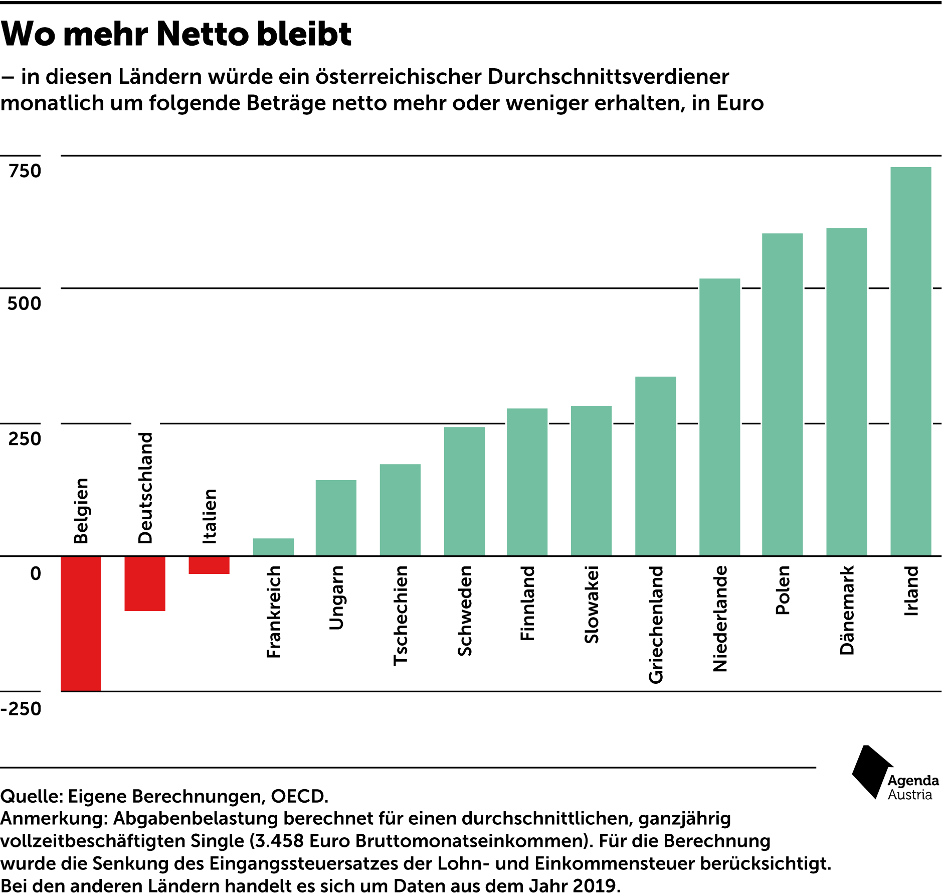 Der neoliberale Thinktank Agenda Austria hat unter Berücksichtigung der beschlossenen Senkung der ersten Tarifstufe die Lohndifferenz eines durchschnittlichen österreichischen Vollzeitbeschäftigten (mit rund 3.500 Euro Monatsbruttogehalt) berechnet. Unter der Annahme, dass die Arbeitsleistung so belastet wäre wie beispielsweise jene der Iren, könnten sie sich über 730 Euro netto mehr freuen – pro Monat. Käme das deutsche Steuersystem bei uns zur Anwendung, hätte ein österreichischer Durchschnittsverdiener monatlich circa 100 Euro weniger am Konto.