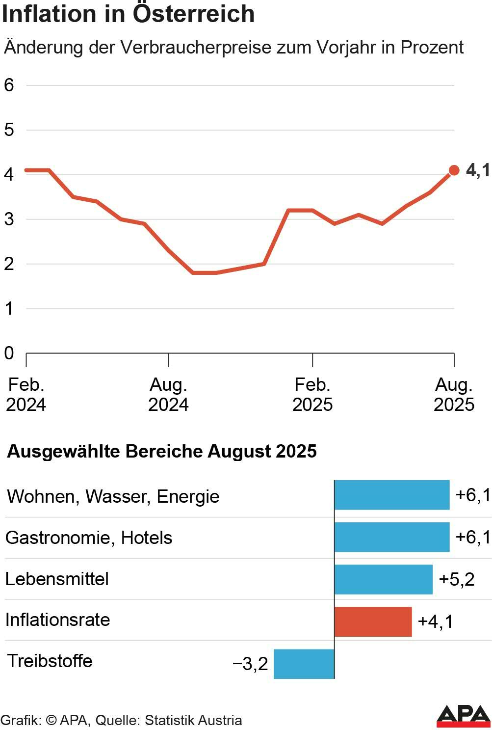 Die Inflation ist im August laut Statistik Austria auf 4,1 Prozent geklettert, nach 3,6 Prozent im Juli. "So hoch war die Teuerungsrate zuletzt im März 2024", bestätigte Statistik-Austria-Generaldirektorin Manuela Lenk am Mittwoch die bereits in der Schnellschätzung erwarteten Zahlen."In vielen Bereichen verstärkte sich der Preisauftrieb." Die stärksten Preistreiber sind aktuell Gastronomie, Strom und Nahrungsmittel.