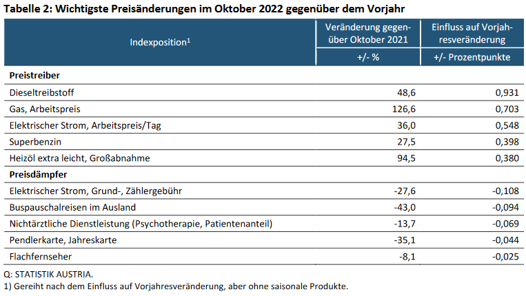 Die Preise für Heizöl stiegen im Oktober gegenüber dem Vorjahr um 94,5 Prozent, nachdem sie sich im September im Jahresabstand um 105,3 Prozent verteuert hatten. Die Strompreise stiegen im Oktober mit plus 24,6 Prozent deutlich weniger dynamisch als im September mit 36,7 Prozent. Das wurde laut Statistik Austria "merklich vom niederösterreichischen Strompreisrabatt beeinflusst". Die Fernwärmepreise hingegen verharrten auf hohem Niveau bei plus 61,2 Prozent.