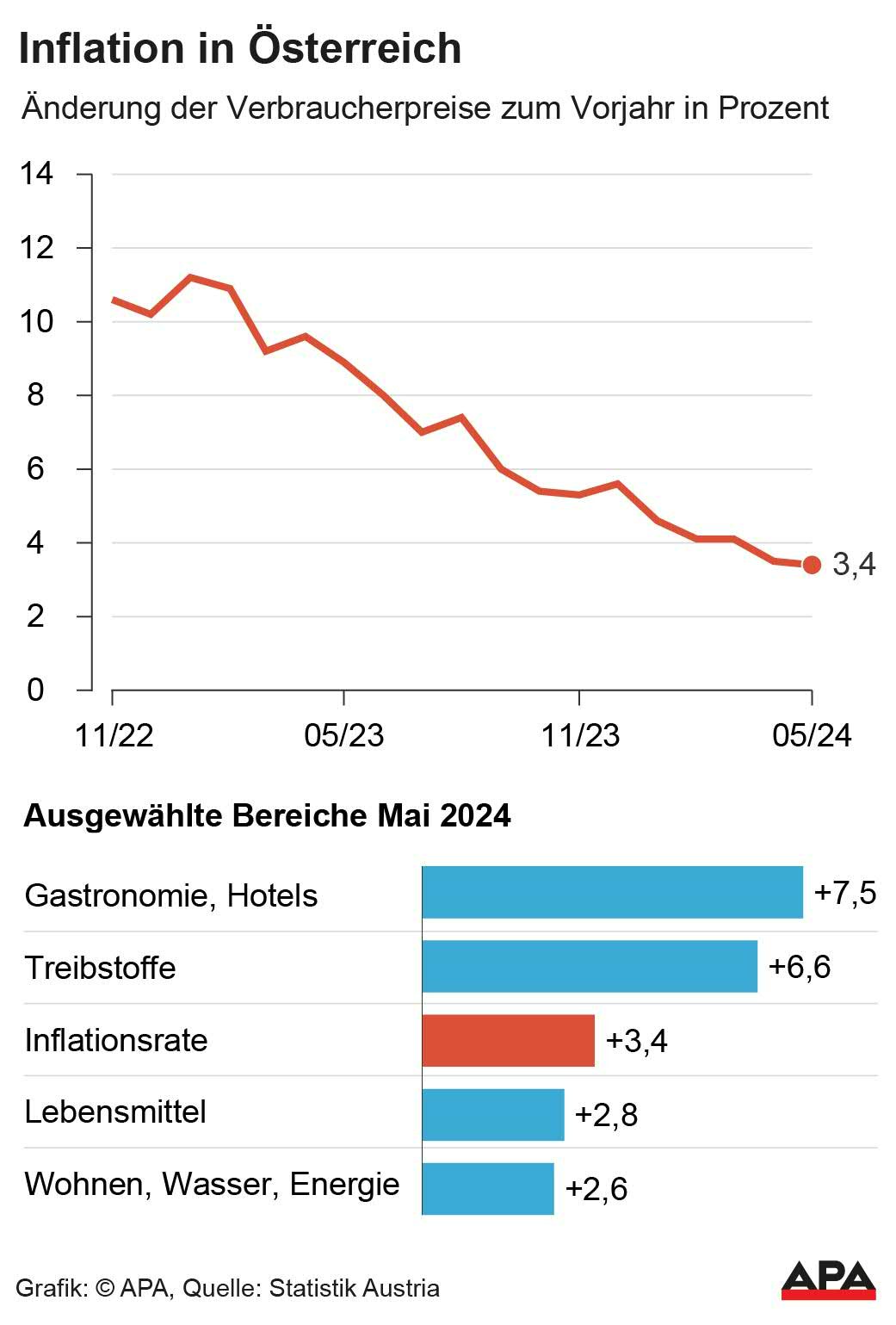 Trotz der im Vergleich zum Euroraum höheren Inflation ist die Teuerung hierzulande auf Jahressicht in wesentlichen Bereichen zurückgegangen. "Vor allem beim Wohnen hat der Preisauftrieb deutlich nachgelassen", sagte Statistik-Austria-Generaldirektor Tobias Thomas. "Auch bei Lebensmitteln stiegen die Preise im Mai unterdurchschnittlich, in der Gastronomie hingegen mehr als doppelt so kräftig wie die allgemeine Inflation." So legten die Preise in Restaurants und Hotels innerhalb eines Jahres um durchschnittlich 7,5 Prozent zu. Sie beeinflussten die Inflationsrate mit 0,99 Prozentpunkten und waren damit der größte Preistreiber. Bewirtungsdienstleistungen verteuerten sich um 7,6 Prozent, Beherbergungsdienstleistungen um 6,6 Prozent.