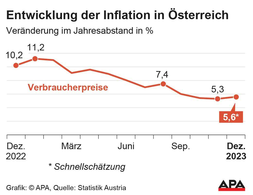Laut einer Schnellschätzung der Statistik Austria betrug die Inflation im Dezember 5,6 Prozent im Vergleich zum Vorjahresmonat.