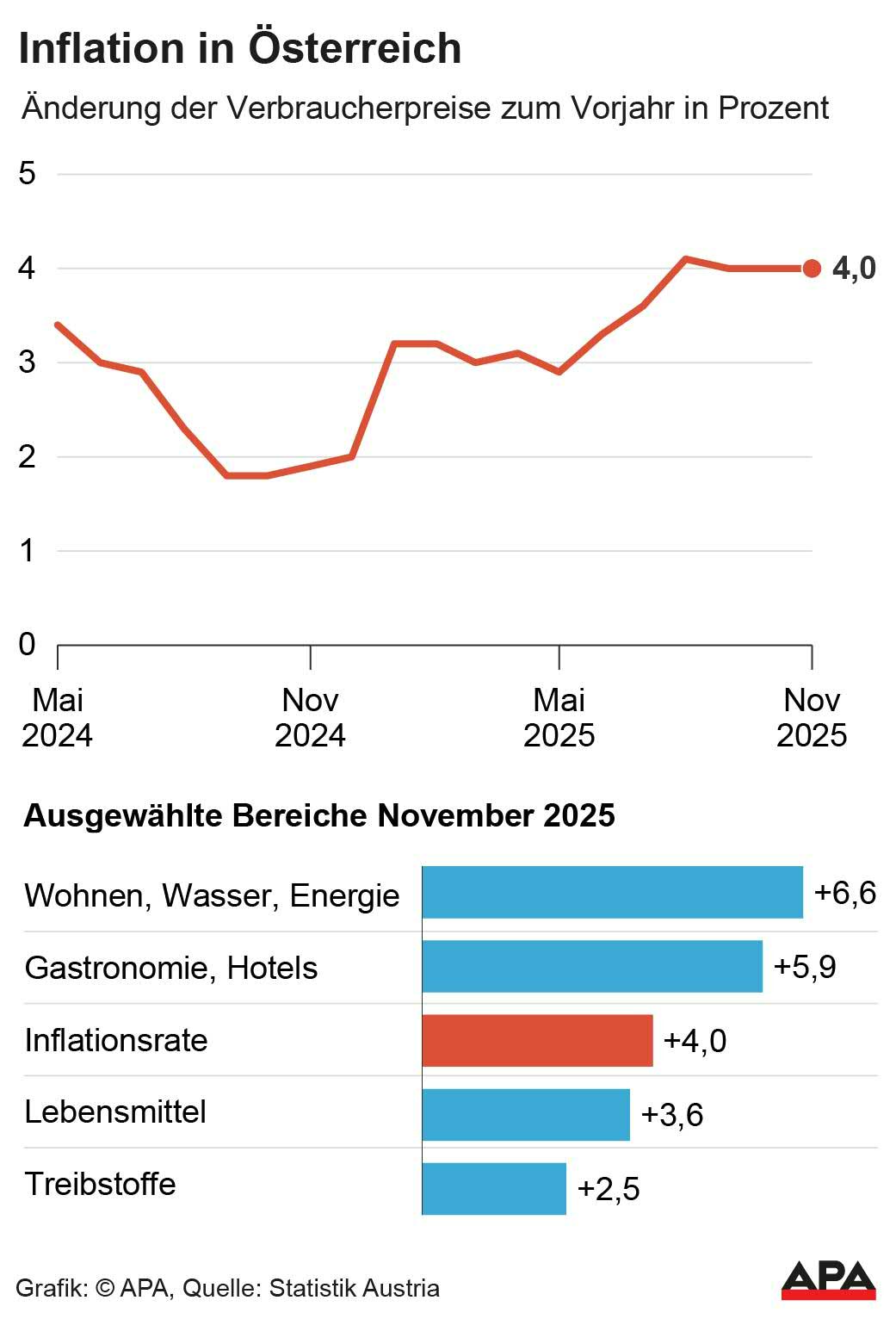 Die Inflation in Österreich ist im November im Vergleich zum Vorjahresmonat bei 4,0 Prozent gelegen und damit den dritten Monat in Folge unverändert hoch. Der endgültige Wert fiel damit etwas niedriger aus als in der Schnellschätzung Anfang Dezember. Gegenüber Oktober stieg das Preisniveau im Schnitt um 0,3 Prozent, teilte die Statistik Austria am Mittwoch mit. Der EU-weit harmonisierte HVPI lag im November ebenfalls bei 4,0 Prozent.