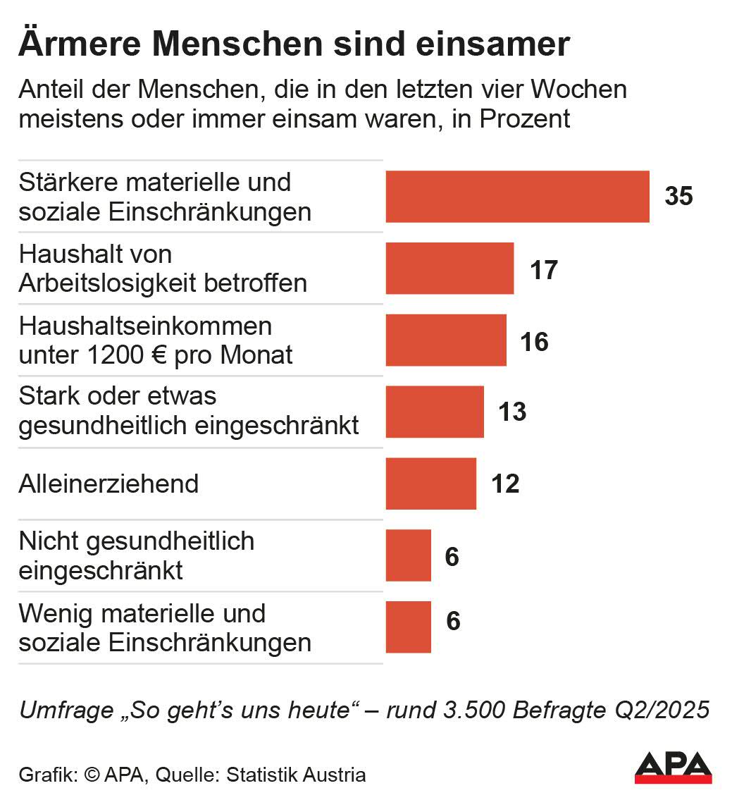 Rund 3.500 Personen wurden dabei im zweiten Quartal 2025 nach dem jeweiligen Befinden in den vergangenen vier Wochen befragt. "Besonders häufig ist Einsamkeit bei Menschen aus Haushalten, die sich eine große Anzahl der Waren, Dienstleistungen oder sozialen Aktivitäten nicht leisten können, die allgemein als für eine angemessene Lebensführung notwendig angesehen werden. In solchen Haushalten betrug der Anteil der immer oder meistens Einsamen 35 Prozent. In Haushalten mit geringeren Einschränkungen machte er lediglich sechs Prozent aus", kommentierte Manuela Lenk, fachstatistische Generaldirektorin von Statistik Austria, die erhobenen Daten.
