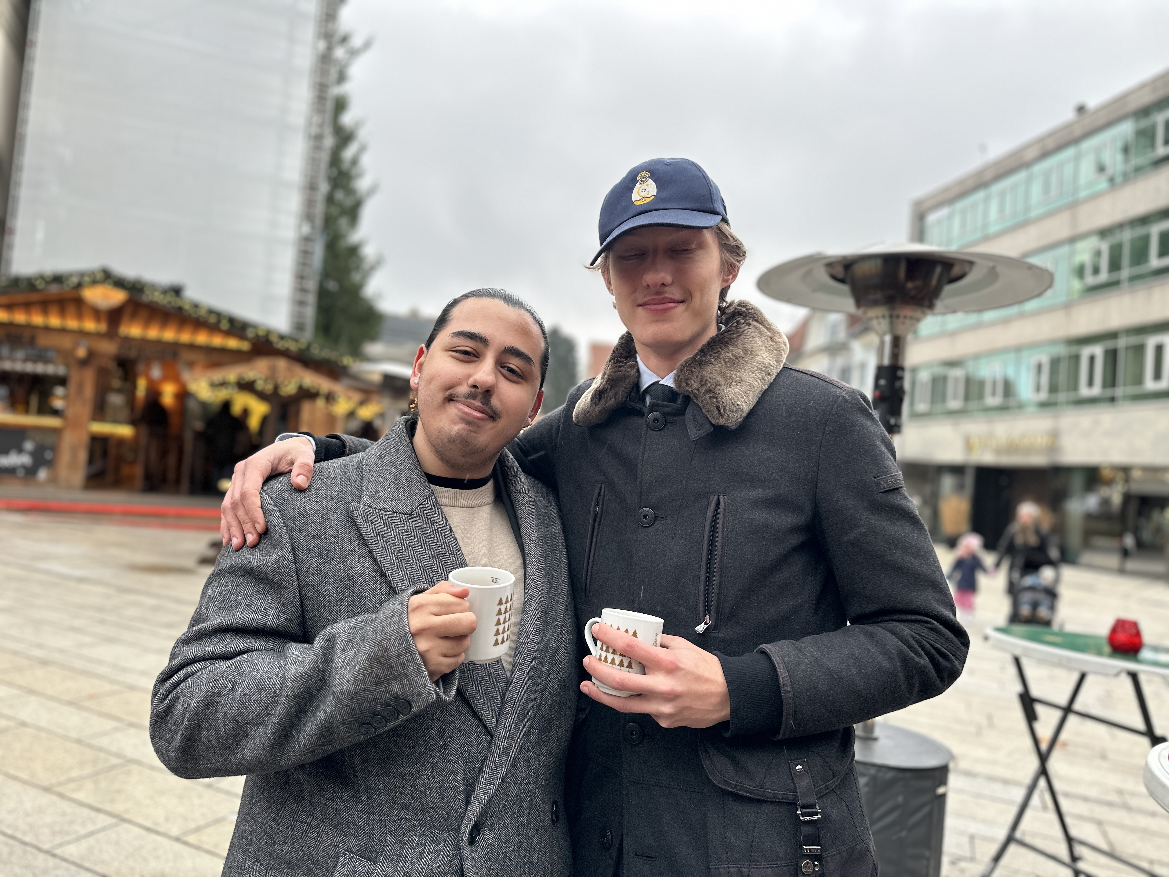 Elias aus Dornbirn und Felix aus Höchst kamen eher spontan auf den Markt. Der Schneefall macht für sie den Unterschied: "Jetzt, wo es schneit, kommt man langsam in Stimmung", meinte Felix. Für ihn gehört auch das Kulinarische dazu: "Mit der Verpflegung kommt man schon richtig rein." Die beiden Freunde quatschten gemütlich unterm Heizstrahler und genossen einen Glühmost.