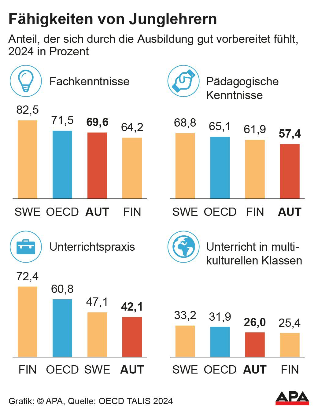 Schlechte Noten für die aktuelle Lehrerausbildung: Nur 42 Prozent der Junglehrerinnen und Junglehrer der Mittelschule und AHS-Unterstufe fühlen sich nach ihrem Abschluss gut auf die Unterrichtspraxis vorbereitet, zeigt die aktuelle Ausgabe der OECD-Lehrerstudie TALIS 2024. 2018 waren es noch 79 Prozent. Österreich landet damit derzeit deutlich unter dem Schnitt der 54 teilnehmenden Länder und Regionen (61). Kritik gab es schon länger, 2026 wird die Ausbildung neu aufgestellt.