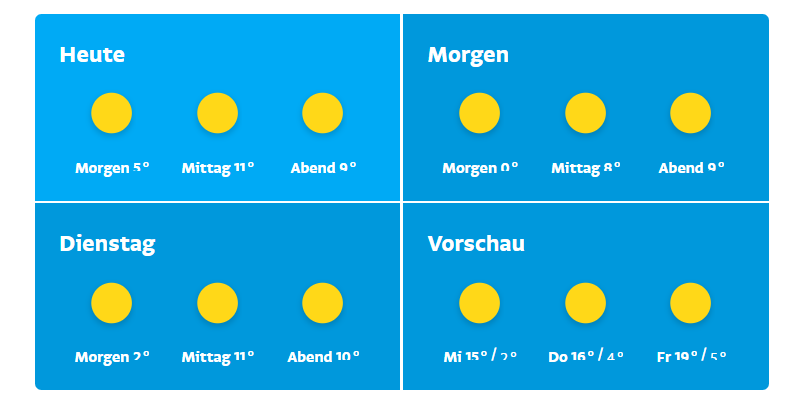 Am Mittwoch geht es mit nur lockeren Wolken überwiegend sonnig weiter. Trotz anhaltend schwacher Nordströmung setzt sich die Erwärmung fort. Die Temperaturtiefstwerte liegen bei -2 bis +3 Grad, die -höchstwerte bei 12 bis 17 Grad.