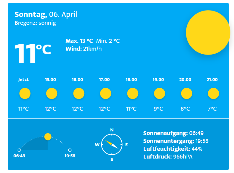Der Nachmittag bringt in ganz Vorarlberg strahlenden Sonnenschein. Mit lebhaftem Nordostwind bleibt es aber deutlich kühler als an den vorangegangenen Tagen, die Temperatur kommt kaum über 9 bis 14 Grad hinaus. In der Nacht auf Montag ist der Himmel sternenklar, dabei kann die Luft stark auskühlen. Verbreitet ist mit leichtem, in höheren Tälern auch mit mäßigem Frost zu rechnen. Die Temperaturtiefstwerte liegen zwischen -8 Grad in Lech und 0 Grad in Bregenz.