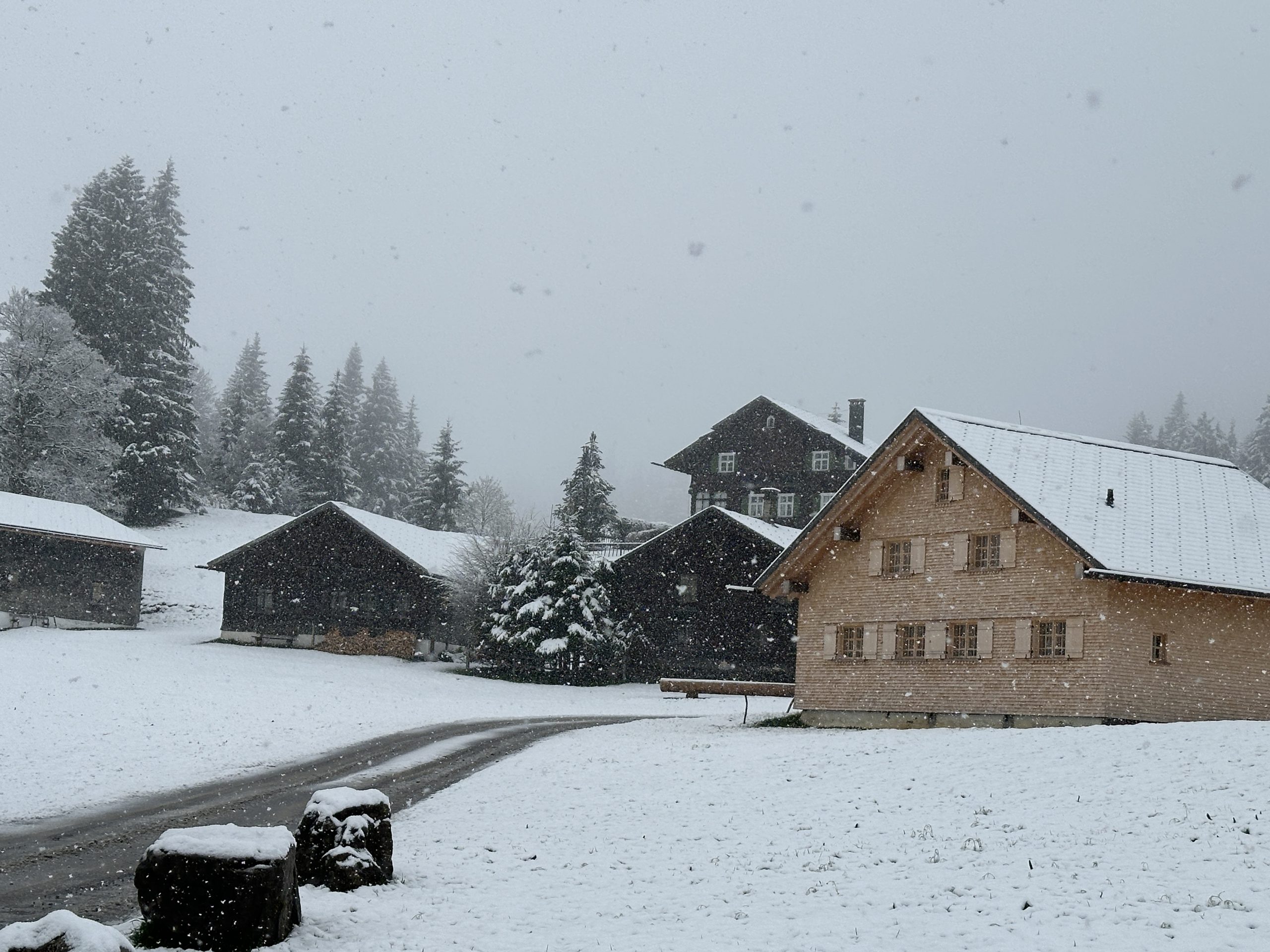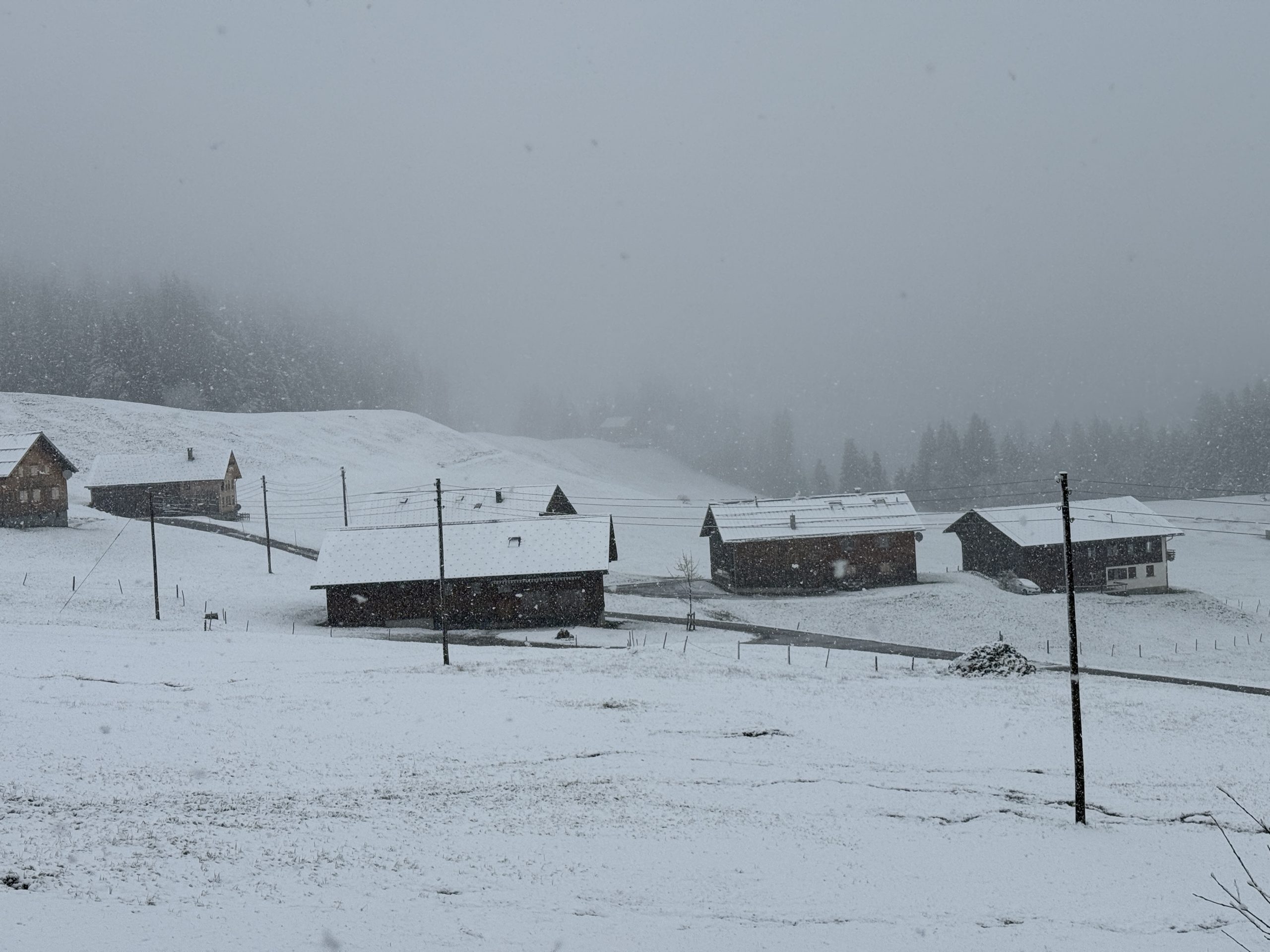 Auch die Schneefallgrenze ist wieder gesunken. Das zeigte sich beim VOL.AT-Lokalaugenschein am Bödele in Schwarzenberg: Während es in den Tälern regnet, zeigen sich die Berge wieder winterlich. Am Mittwochvormittag schneite es am Bödele. Knospende Bäume und blühende Blumen wurden vom Schnee zugedeckt. Auch der Schneepflug war unterwegs.
