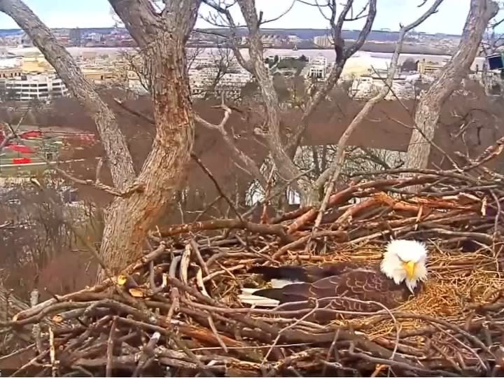 Es liegt hoch über einem Trainingsgelände der Hauptstadt-Polizei und gehört dem Weißkopfseeadler-Pärchen “Liberty” und “Justice”. Dass die beiden US-Wappentiere auch bei schwerem Seegang so an ihrem Sitzplatz festhalten, hat einen guten Grund: Sie bebrüten zwei Eier, aus denen bald zwei junge Weißkopfseeadler schlüpfen sollen.