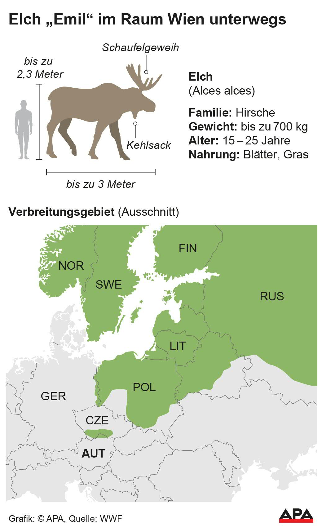 Das Tier dürfte um das Stadtgebiet einen Bogen gemacht haben. Bei der Wiener Polizei seien keine Meldungen über die Sichtung eines Elchs eingegangen, sagte eine Sprecherin auf APA-Anfrage. Noch am Sonntag hatte es den Anschein, dass sich der vergangene Woche erstmals im nördlichen Weinviertel wahrgenommene Elch auf den Weg in die Bundeshauptstadt machen könnte. Darauf deutete ein von der Landespolizeidirektion Niederösterreich auf Facebook veröffentlichtes Video hin, das Beamte der nahe Wien befindlichen Inspektion Korneuburg aufgenommen hatten.