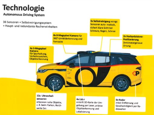 Die Technologie für autonomes Fahren stammt vom chinesischen Technologiekonzern Baidu. 36 Sensoren, Kameras sowie Radar- und Ultraschallsensoren sorgen für die sichere Navigation – auch bei schlechten Wetterverhältnissen. Die Sensoren reinigen sich automatisch.