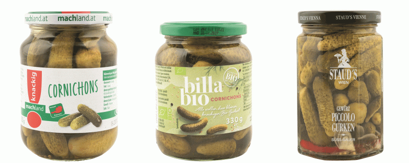 Immerhin konnten sich drei Produkte mit der Bewertung "gut" im Spitzenfeld positionieren – und lagen dabei knapp beieinander: Die Machland Cornichons kamen auf 67 von 100 möglichen Punkten, gefolgt von den Billa Bio-Cornichons mit 66 Punkten und den Staud’s Gewürz Piccolo Gurken süß-sauer, die mit 65 Punkten nur knapp dahinter lagen.
