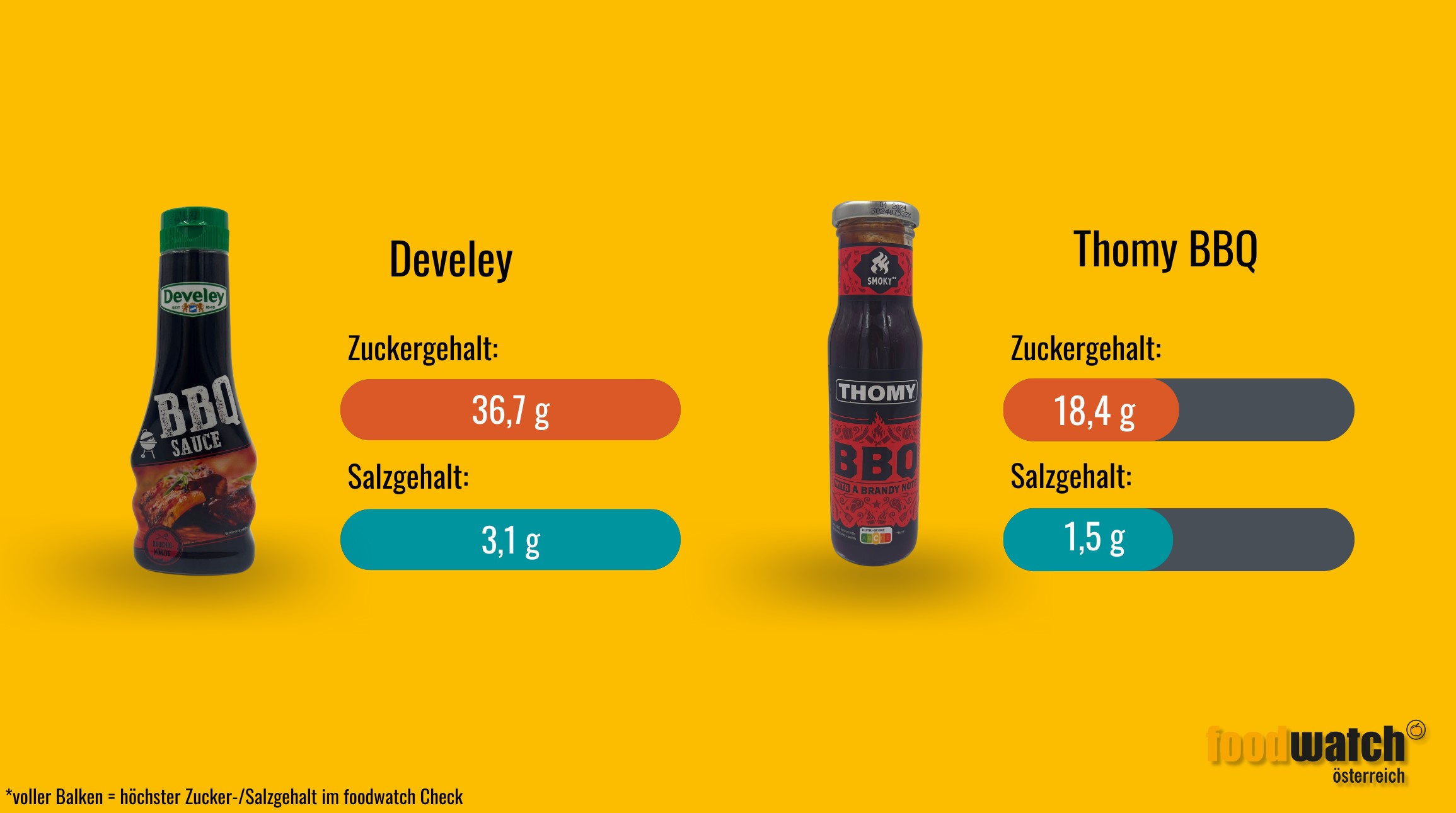 Noch drastischer hinsichtlich des Zuckergehaltes sieht es bei den Barbecue-Saucen aus. Der Zuckergehalt des Spitzenreiters dieser Kategorie ist die BBQ-Sauce von Develey. Heidi Porstner kommentiert: "Mit einer Portion der Develey BBQ-Sauce liegen umgerechnet gleich 2 Stück Würfelzucker neben dem Steak, dem Grillkäse oder der gegrillten Zucchini auf dem Teller. Da isst man die Nachspeise schon mit dem Hauptgang mit."
