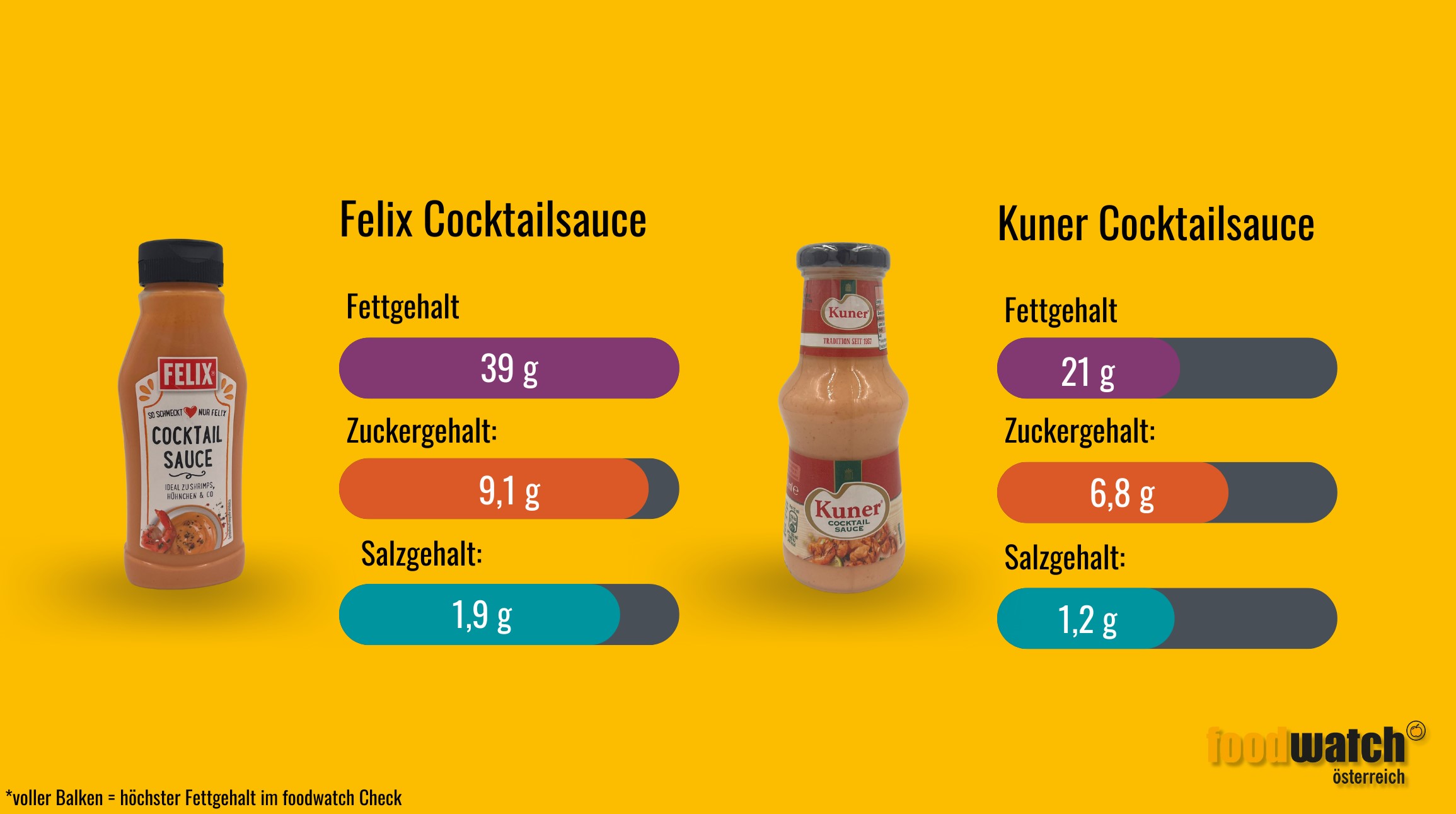 Bei den Cocktail-Saucen spielt Zucker als Zutat eine untergeordnete Rolle. Dafür gibt es beim Fettgehalt deutliche Unterschiede. Im foodwatch Grillsaucen-Check sind zwei bekannte Marken am obersten und am untersten Ende der Skala: Die Cocktail-Sauce von Felix enthält fast doppelt so viel Fett wie die Cocktail-Sauce von Kuner. Hinsichtlich des Fett-Gehaltes schneiden auch die Diskontmarken von Hofer (Le Gusto) und Lidl (Kania) ähnlich ab wie Kuner.