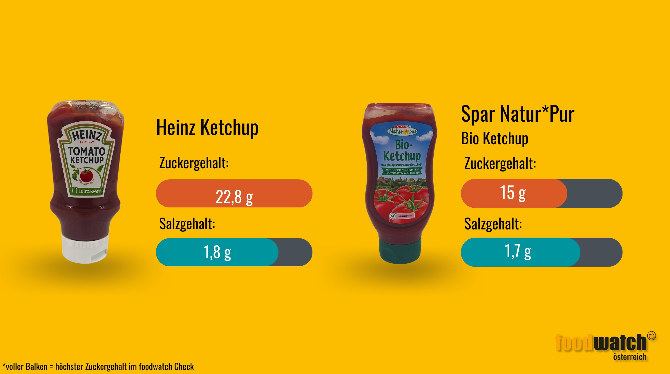 Der Spitzenvertreter in puncto Zuckergehalt ist das Tomatenketchup von Heinz: Über ein Stück Würfelzucker steckt in einer Portion Ketchup (gerechnet mit 20 g). Heidi Porstner, Leiterin von foodwatch Österreich und Ernährungswissenschafterin, sagt dazu: "So süß muss Ketchup echt nicht sein. Andere Hersteller schaffen es mit deutlich weniger Zucker. Ketchup gehört für viele von uns einfach zum Grillen dazu. Dass man da aber gleich so viel Zucker auf den Grillteller serviert bekommt, ist nicht notwendig."
