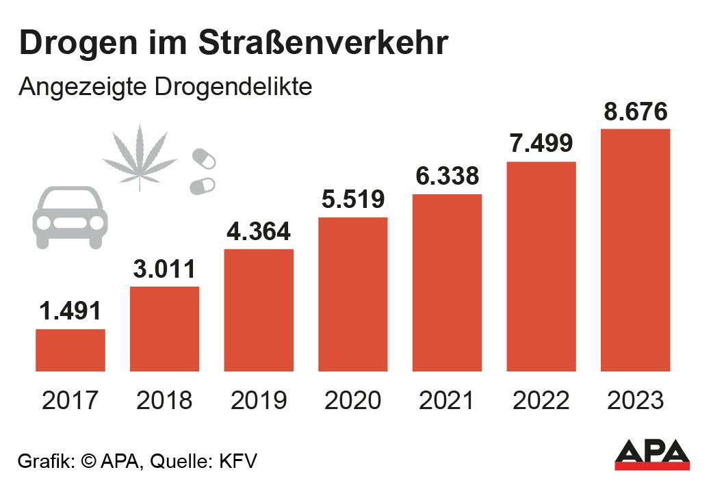 8.676 Personen wurden laut dem Innenministerium im Vorjahr hierzulande unter Drogeneinfluss im Straßenverkehr von der Exekutive angezeigt. Die Zahl habe sich im Vergleich zu 2017 versechsfacht, als es "nur" 1.500 Anzeigen gegeben hatte. "Wir gehen aber davon aus, dass ein Großteil der beeinträchtigten Lenker im Straßenverkehr, etwa auch bei Unfällen, unentdeckt bleibt", sagte Klaus Robatsch, Leiter des Bereichs Verkehrssicherheit beim KFV.