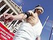 Die Augen wurden verbunden, die Toga flatterte, die an einem Schirmständer montierte Infusion hatte Hochbetrieb. „Wie geht’s dir?“ Der Leidende grinste. „Ned grinsen!“, gemahnte eine Aktivistin zu mehr Ernsthaftigkeit der männlichen Justitia. Nach etwa 15 Minuten verging dem griechischen Jesus ein bisserl das Lachen. „Wasser? Wasser!“ Hastig nuckelte er an einer Flasche, parallel maß die Krankenschwester den Blutdruck. „Sollma aufhören?“ „Es geht noch!“ „Hörma auf, oder?“ Wurde auch Zeit, denn von links näherte sich schon die nächste Demo, eine Schülergruppe mit Transparenten. Zurück blieben ein paar rot gefärbte Pflastersteine.