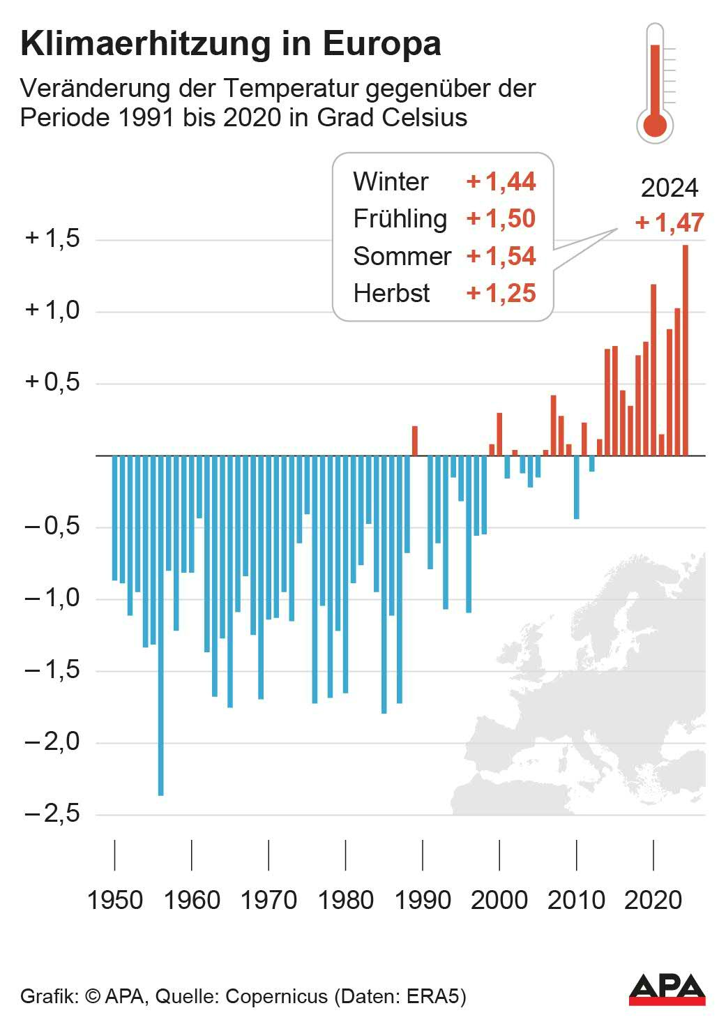 Fest stand schon, dass der europäische Kontinent wie auch die ganze Welt 2024 die höchste Durchschnittstemperatur seit Beginn der Aufzeichnungen erlebten. Laut WMO lag diese Temperatur 2024 weltweit 1,55 Grad über dem industriellen Niveau (1850-1900). In Europa waren es plus 2,92 Grad, wie Copernicus berichtet hatte. Rekordhitze gab es 2024 in Mittel-, Ost- und Südosteuropa. Auch in Deutschland war 2024 das wärmste Jahr seit Beginn der Messungen, wie der Deutsche Wetterdienst (DWD) berichtet hatte.