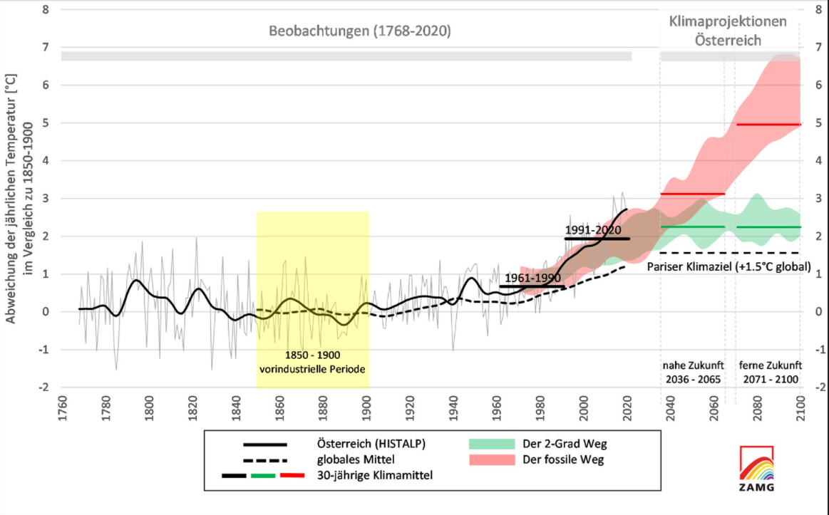 Demnach ist es hierzulande seit Beginn der Industrialisierung um rund zwei Grad wärmer geworden. Folgt keine Trendumkehr, wird die Erwärmung bis zum Jahr 2100 bei mindestens fünf Grad liegen.