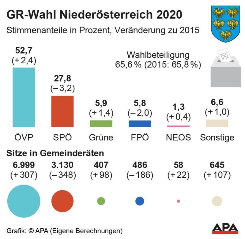 In Amstetten holte die ÖVP Platz eins. Die Volkspartei legte um 18,38 Prozentpunkte auf 42,98 Prozent zu. Das sind künftig 19 (plus neun) der 41 Mandate. Die SPÖ fuhr in der Bezirksstadt im Westen Niederösterreichs ein Minus von 9,25 Prozentpunkten ein. Sie erreichte nur mehr 37,20 Prozent oder 16 Sitze (minus vier) im Rathaus.