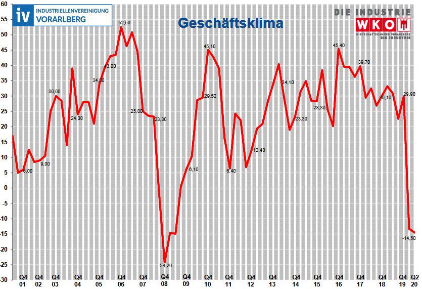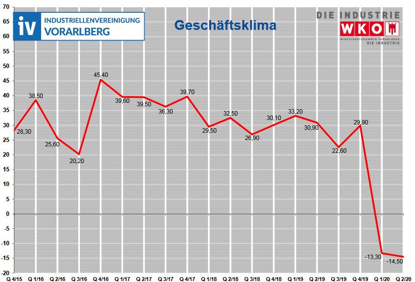 44 Vorarlberger Unternehmen mit fast 26.000 Beschäftigten haben sich an der aktuellen Konjunkturumfrage im zweiten Quartal 2020 beteiligt. Der Geschäftsklimaindex, der Mittelwert der Einschätzung zur aktuellen Geschäftslage und jener in sechs Monaten, ist nach dem drastischen Absturz um 45 Prozentpunkte im ersten Quartal nochmals von -13,30 auf -14,50 zurückgegangen.