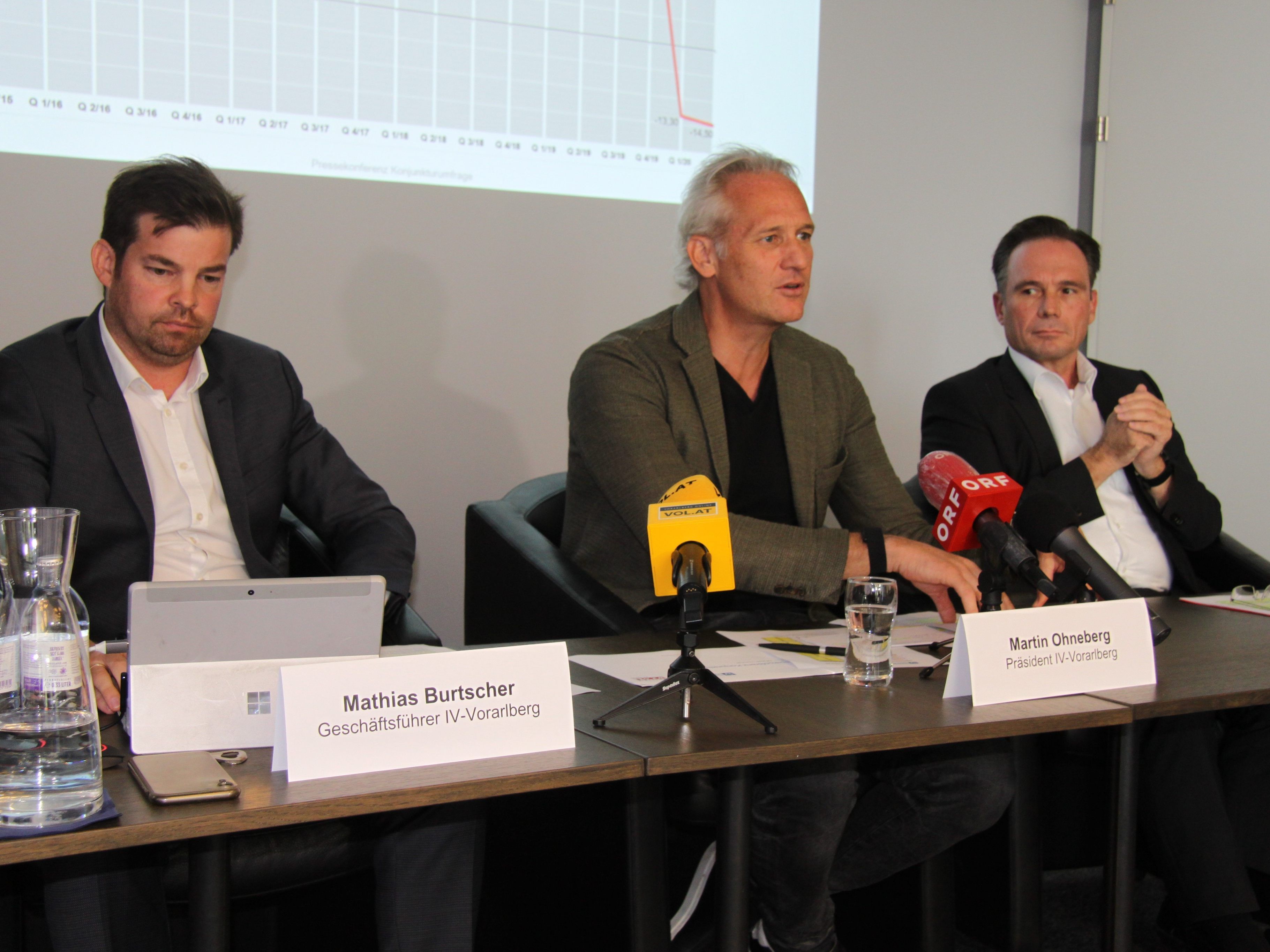 Wie ergeht es der Vorarlberger Wirtschaft mit den Folgen der Coronakrise im Land? IV-Präsident Martin Ohneberg, IV-Geschäftsführer Mathias Burtscher und Michael Amann, Geschäftsführer der Sparte Industrie in der Wirtschaftskammer Vorarlberg, präsentierten am Montagvormittag die Ergebnisse der Konjunkturumfrage im zweiten Quartal 2020. "Wir sind noch nicht über den Berg", erklärte Ohneberg. Die Vorarlberger Industrie kämpfe nach wie vor massiv mit den Folgen der Coronakrise.