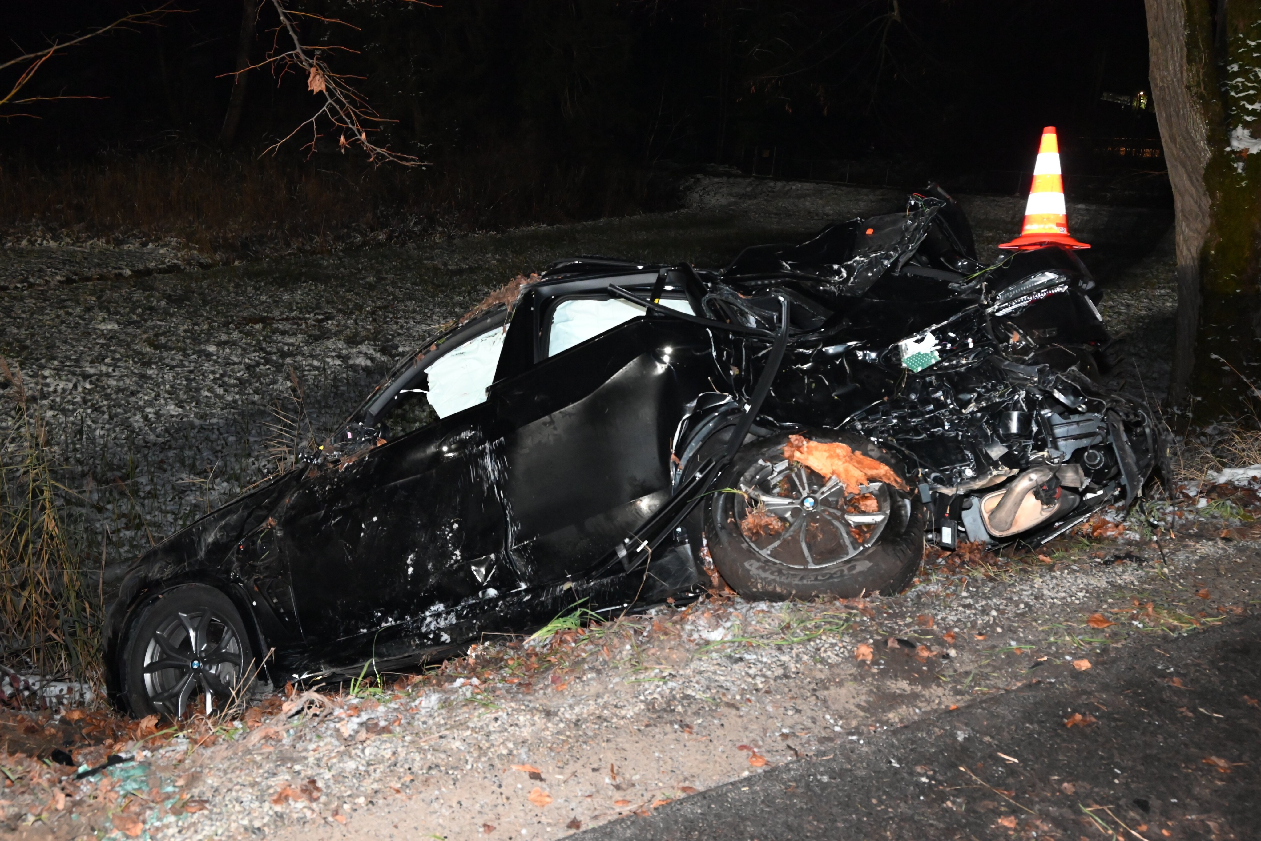 Doch der Unfallverlauf endete nicht dort: Das Auto wurde zurück auf die linke Straßenseite geschleudert, wo es mit dem Heck gegen einen Baum prallte. In der Folge drehte sich das Fahrzeug, rutschte weiter und kollidierte schließlich frontal mit einem weiteren Baum. Erst in einer angrenzenden Böschung kam der schwer beschädigte Wagen zum Stillstand.