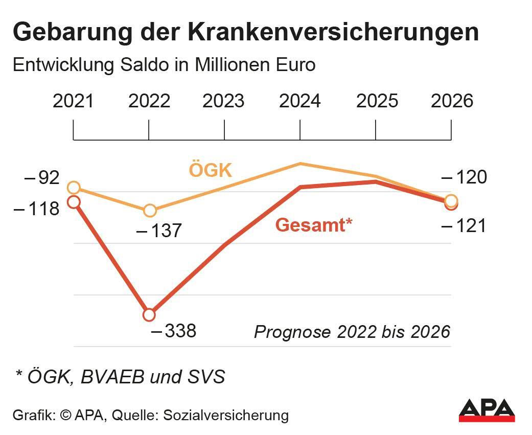 Im Vorjahr hatten die drei Krankenversicherungsträger zusammen ein Defizit von 118,3 Millionen Euro erwirtschaftet. Dieses soll zwar heuer auf 337,8 Mio. Euro anwachsen, dann aber auf 203,7 Mio. Euro im kommenden Jahr, auf 91,6 Mio. Euro im Jahr 2024 und auf 81,7 Mio. Euro im Jahr 2025 sinken. Für 2026 wird dann wieder ein Anstieg auf 121,4 Mio. Euro erwartet.