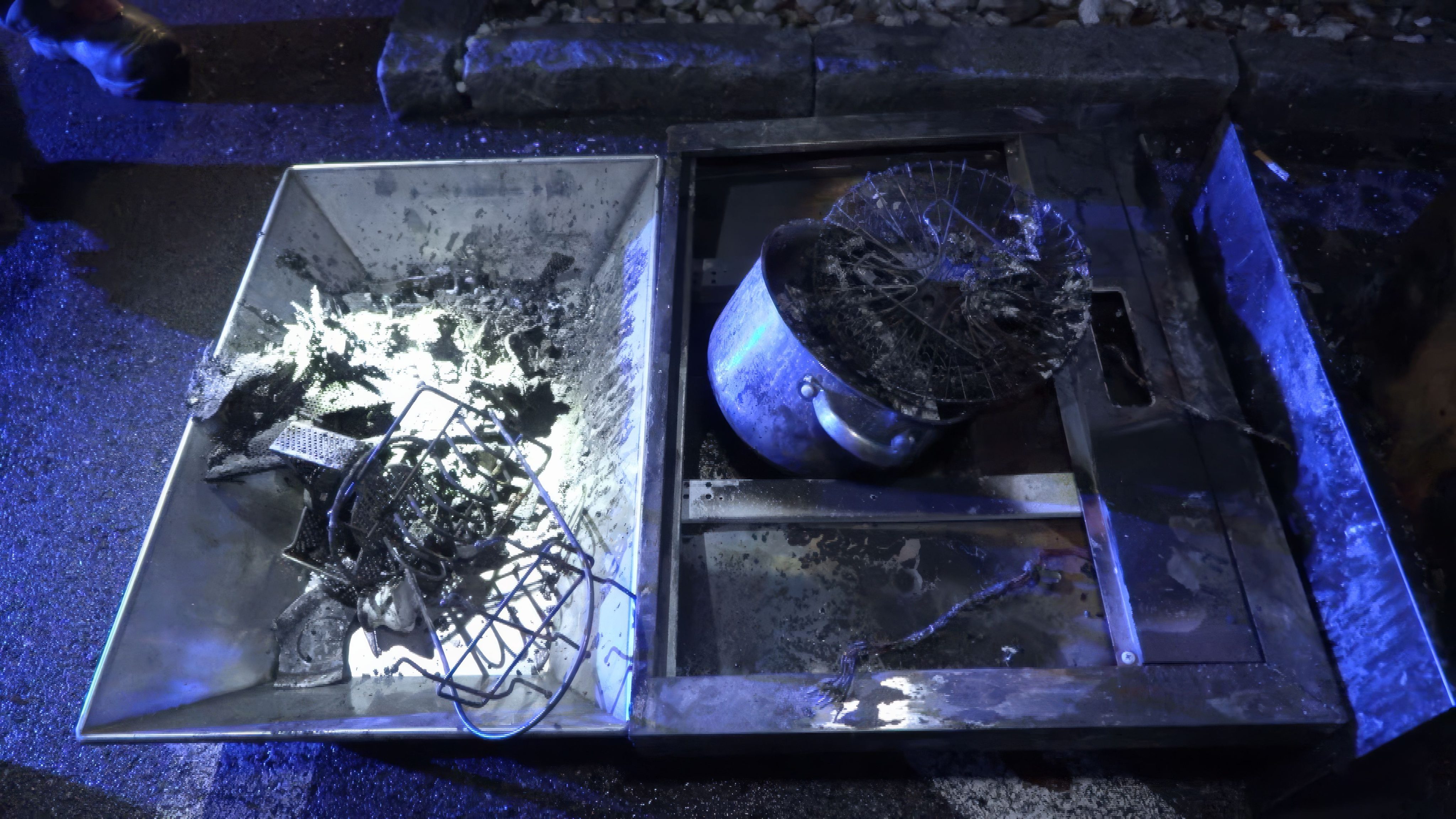 Ausgeräumt und abgelöscht: Die Feuerwehr brachte verkohlte Küchenbestandteile und den Topf ins Freie.