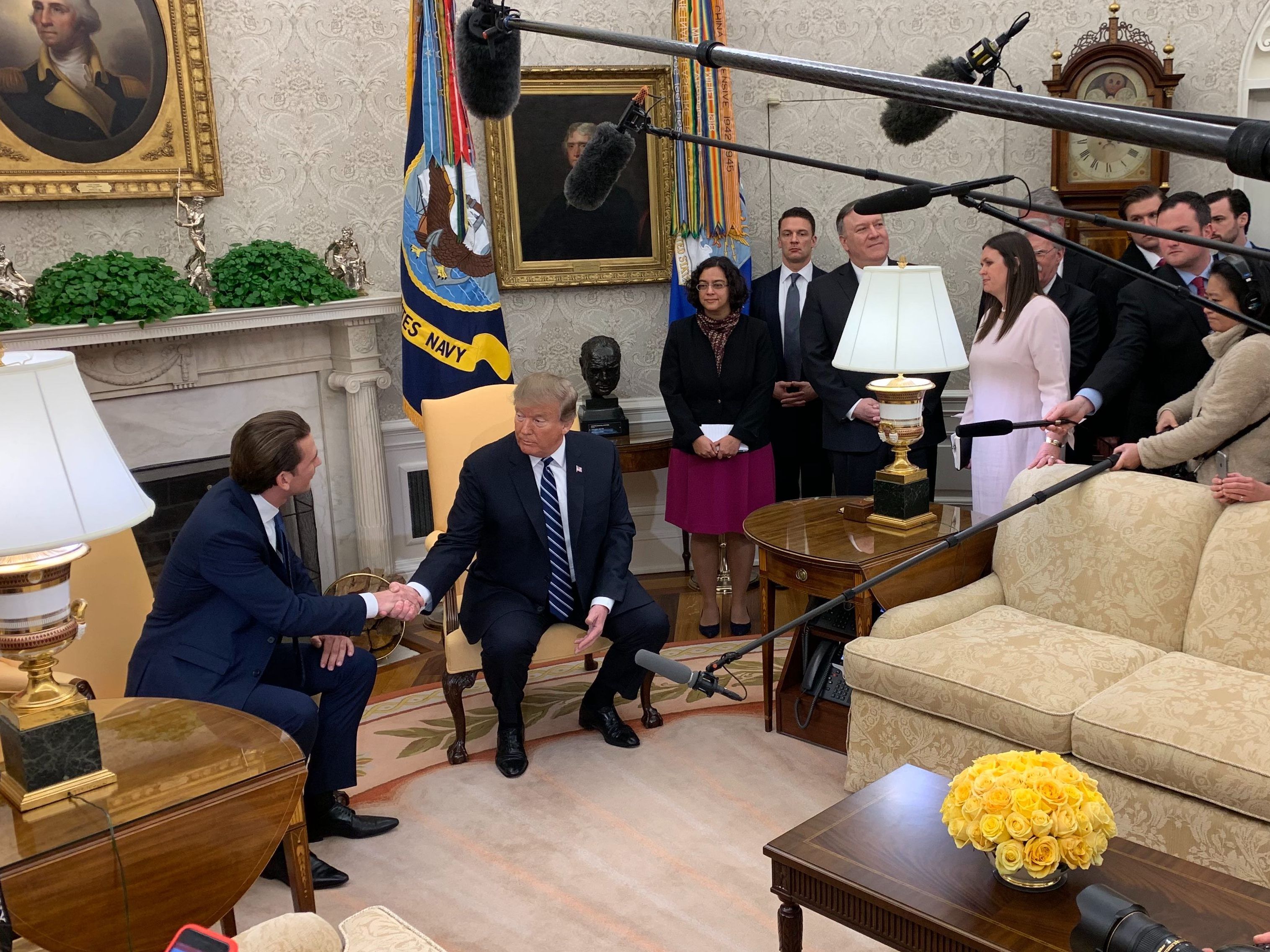 Trump hatte den Kanzler pünktlich um 13.45 Uhr Ortszeit am Eingang zum Westflügel des Präsidentensitzes willkommen geheißen. Kurz ist der erste österreichische Regierungschef seit über 13 Jahren, der einen US-Präsidenten in Washington trifft. Nach dem Empfang trug sich Kurz im Roosevelt Room ins Gästebuch ein, ehe er sich mit Trump vor den Kamin ins Oval Office setzte.