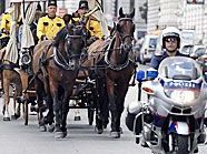 Kurz vor 11.30 Uhr hatte das Warten ein Ende: Fanfaren ertönten und die fünf historischen Kutschen, allen voran ein Vierergespann, zogen in Polizeibegleitung durch das Michaelertor auf den Heldenplatz. Aus der Handvoll übrig geblieben Fans wurde rasch eine riesige Menschenmenge, die sich mit ihren Fotoapparaten um Wagen und Pferde drängten. Autogramme mussten geschrieben werden, die Zeit war jedoch knapp.